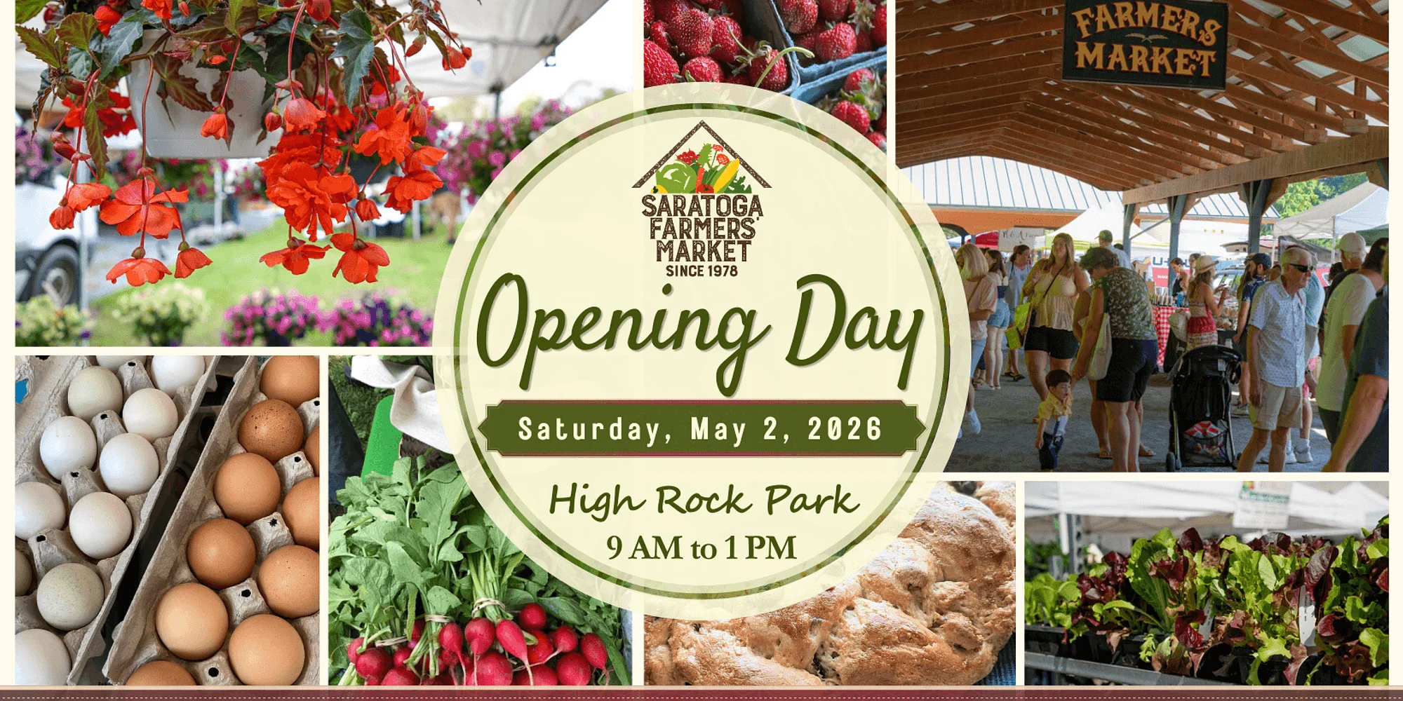@ Join us Saturday, May 2 as the Saratoga Farmers’ Market returns to High Rock Park and kicks off its 48th season! Celebrate opening day with live music, face painting for the kids, activities, and an incredible selection of locally grown food, flowers, and prepared favorites. Meet new vendors, reconnect with familiar faces, and soak in the vibrant energy of the market. We’re also launching our Bike to the Market initiative, a new composting program, and more! Beginning May 2, the market will be open Saturdays from 9 AM to 1 PM and Wednesdays from 3 to 6 PM through the end of October. Open to the community Add to calendar Google Calendar iCalendar Outlook 365 Outlook Live