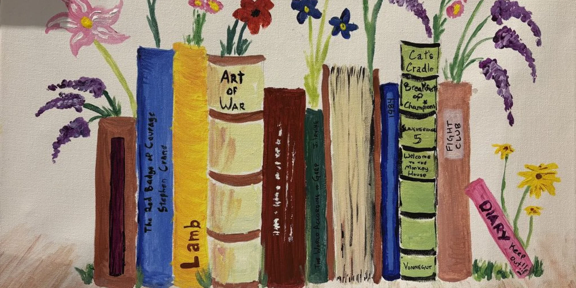 Calling all books lovers! Join us for this fun and totally customizable painting. What titles will you put on your flowery shelf? Beginners welcome!