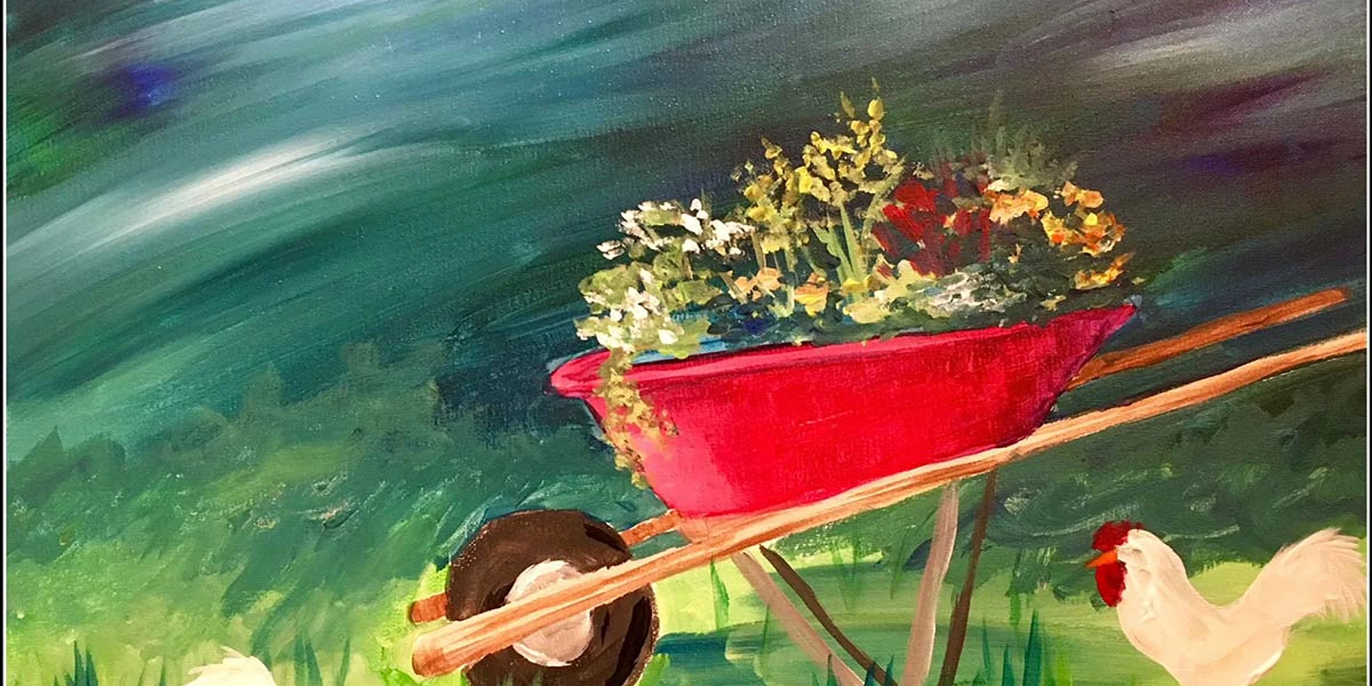 Bring a dramatic twist to spring with a “paint and drip” scene of chickens amid a stormy sky. Dark, moody clouds blend with vibrant spring colors, while lively drips capture the energy of wind and rain. This session balances tension and whimsy, letting you create dynamic contrasts between the fluffy chickens, blooming flowers, and the stormy atmosphere for a truly expressive piece.