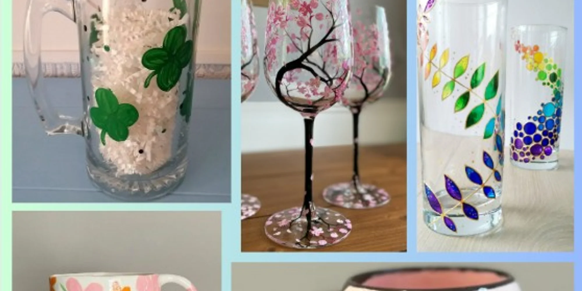 Come check out our selection of wine glasses, coffee cups, vases, mason jars and more available to paint. Our artists will guide you, and each seat includes two items to paint (wine glass or equivalent). Choose your design from our in-studio examples, or create something all your own!
