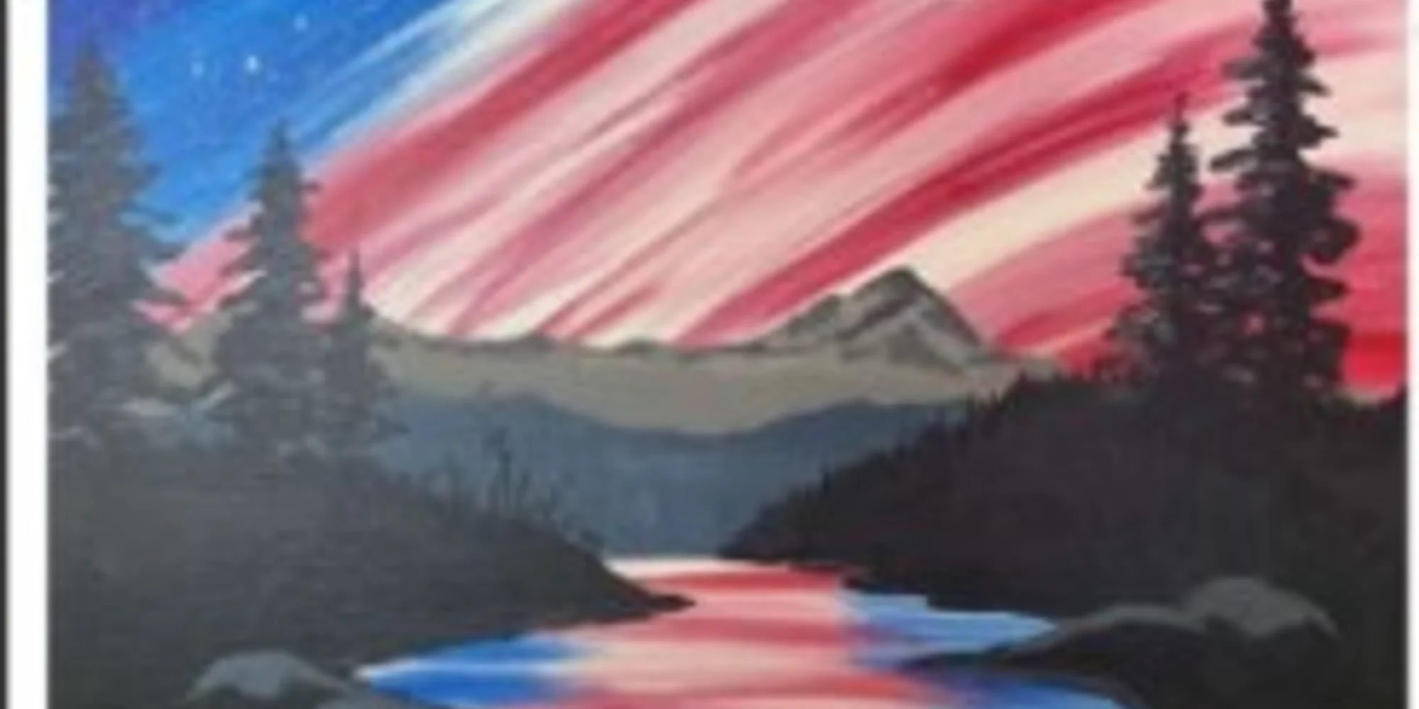 Create a bold and uplifting “paint and drip” piece featuring a flag flowing across a vibrant sky. We are a veteran owned business so all veterans get one free drink. Come paint with us and let freedom ring!