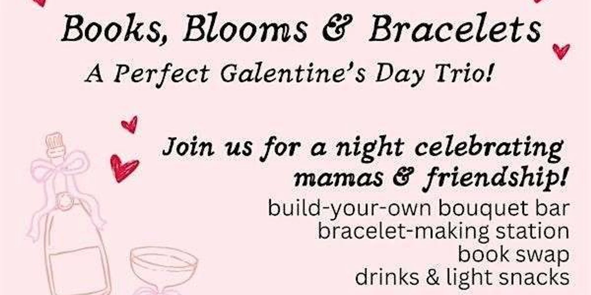 A Perfect Galentine’s Day Trio! Hey mama, grab your besties (or come solo!) for a Galentine’s Night Out on 2/10 at Book Love. Bring any used and loved books to swap for your next read and enjoy a build-your-own bouquet bar with in-season flowers and a bracelet-making station! All tickets includes one drink and light snacks. Come connect, unwind, and treat yourself – a night made just for you! All events are open to moms, soon-to-be moms and moms on their journey to motherhood. Register on the Event Website.