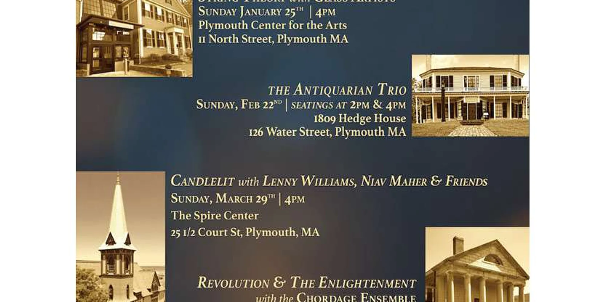 The Candlelight Concert Series offers four unique musical experiences in Plymouth’s most historic venues:  Plymouth Center for the Arts, The Antiquarian Society’s Hedge House, The Spire Center, and Pilgrim Hall Museum. Hundreds of flickering candles will create a serene ambiance, offering a magical, immersive escape for the evening. Each Concert $55 | Concert Series $220 – Members will receive a Member Discount Code for 10% off Schedule: Concert I: String Theory featuring Glass Artists Sunday January 25th | 4pm Plymouth Center for the Arts, 11 North St, Plymouth Concert II: The Antiquarian Trio Sunday, Feb 22nd | Two Seatings at 2pm & 4pm 1809 Hedge House, 126 Water Street, Plymouth Concert III: Lenny Williams, Niav Maher & Friends Sunday, March 29th | 4pm The Spire Center, 25 1/2 Court St, Plymouth Concert IV: Revolution & The Enlightenment with the Chordage Ensemble Sunday, April 26th | 5pm Pilgrim Hall Museum, 75 Court Street, Plymouth
