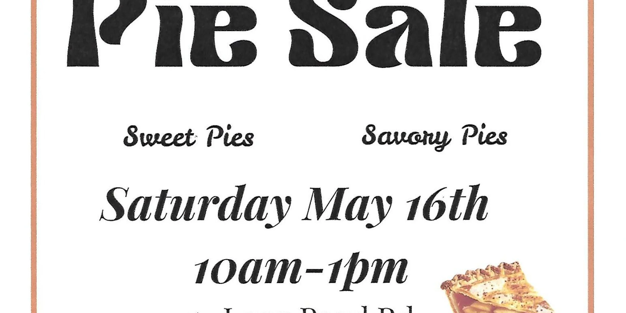 Looking for an opportunity to help your community and get a piece of the pie. Come down on Saturday May 16th from 10am-1pm and see what we have for sale. There will be many options both savory and sweet to choose from baked with lots of love from members of your own Plymouth Community.