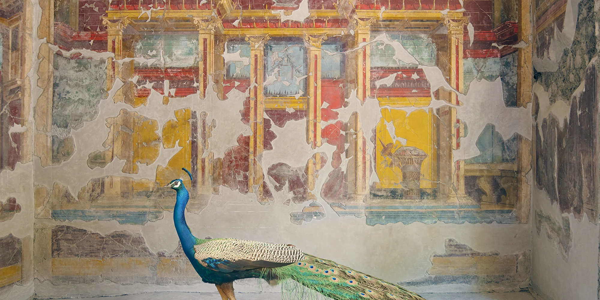 Danziger Gallery is pleased to present Scavi, Karen Knorr’s newest ongoing series. “Scavi,” the Italian word for “excavations,” began in 2023 after Knorr visited archaeological sites around Naples. The work draws on Roman and Greek myths found in the painted frescoes of Pompeii and Herculaneum. In 79 AD, Mount Vesuvius erupted, burying several cities. Pompeii, Herculaneum, and nearby sites were preserved under ash for centuries. Today they are UNESCO World Heritage sites, visited by millions each year. The frescoes uncovered there show both daily life and myth. Some paintings depict food, flowers, and household objects, offering a glimpse of ordinary Roman life. Others tell well-known Greek stories, such as Frisso and Elle fleeing their homeland, or “Leda and the Swan” in which Zeus transforms himself into a swan to seduce Leda queen of Sparta. Animals continue to play an important role in Knorr’s new work. They appear in the ancient frescoes and in the preserved remains found at the sites. Plaster casts made after the eruption revealed that animals died alongside humans, showing how closely their lives were connected. Indeed, wealthy Romans kept exotic animals—monkeys, parrots, leopards, and lions—as symbols of status. In Scavi, these animals return as reminders of the lasting power of myth and the fragile nature of life.