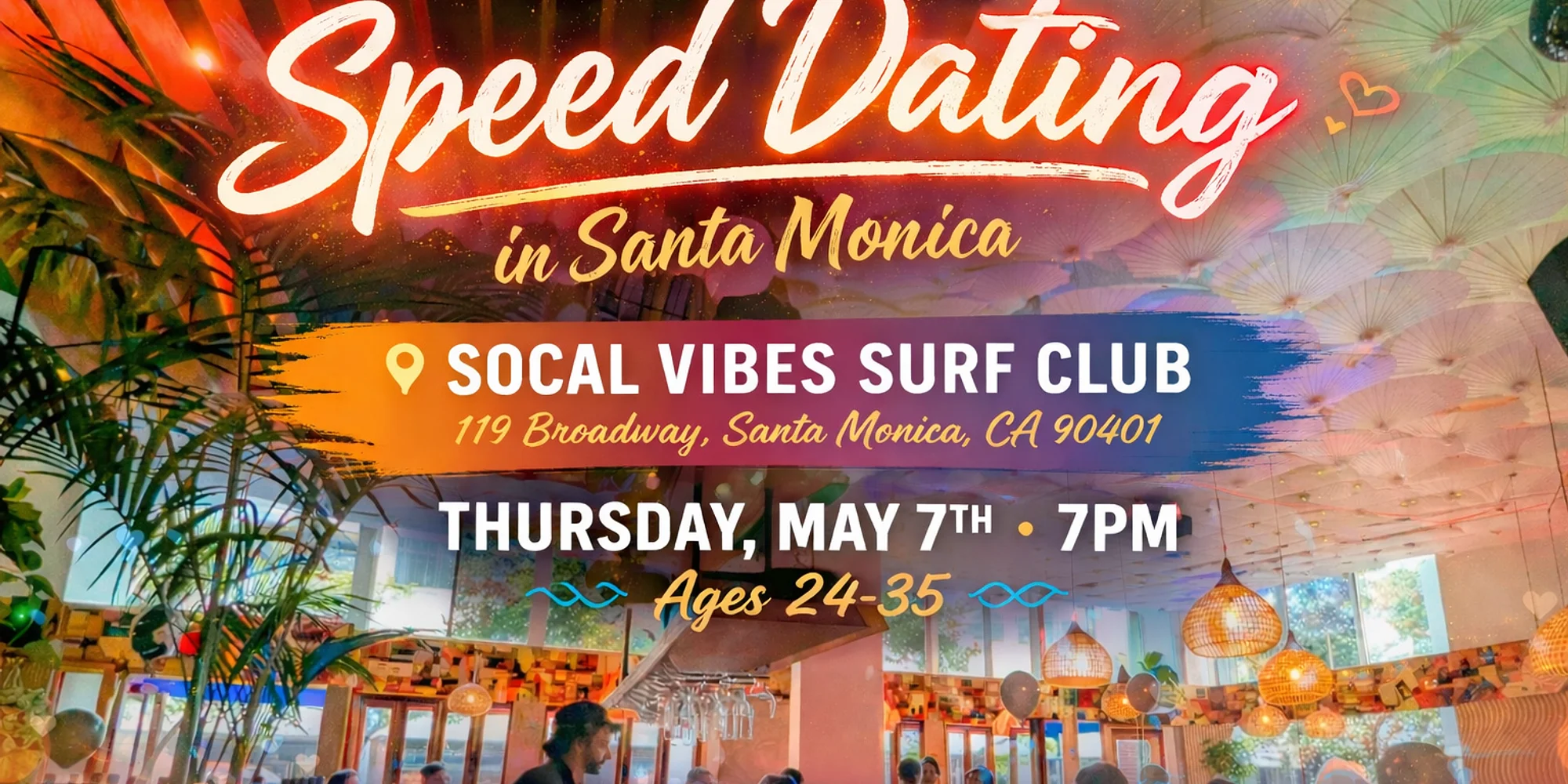 Santa Monica Speed Dating for Busy Singles Ages 24-35 More Dates, Less Wait. (Hetero) Date: Thursday, May 7th, 2026 Time: 7:00 PM – 9:30 PM Venue: SoCal Vibes Co. Surf Club (119 Broadway, Santa Monica, CA 90401)
