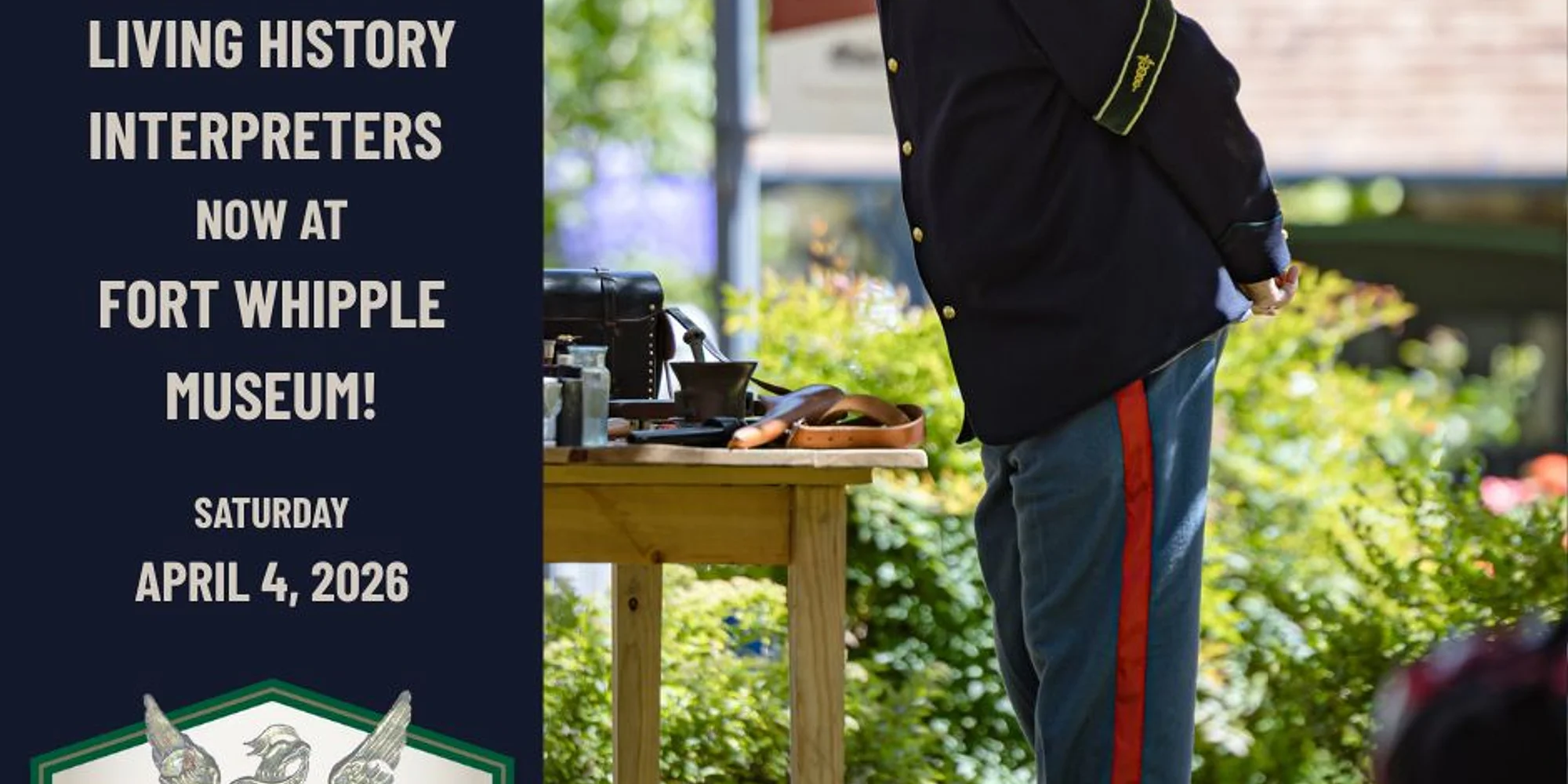 We’re excited to announce that Living History interpreters will be at the Ft. Whipple Museum on the first Saturday of each month from 10 AM to 3 PM, April through November. Join us for our next Living History Day on Saturday, April 4, 2026. Interpreters dressed in accurate period attire will discuss and demonstrate the use of military and medical artifacts from the time when Ft. Whipple was in operation. Demonstrations will include medical tools, firearms, and other items commonly found in the kit of a typical trooper stationed on the Arizona frontier. As with Living History Adventure on the main Sharlot Hall Museum campus, Living History at Ft. Whipple Museum runs from April through November. Admission to the Ft. Whipple Museum is free to the public, including during first-Saturday Living History days. The Ft. Whipple Museum is open Fridays and Saturdays, 10 AM to 4 PM.
