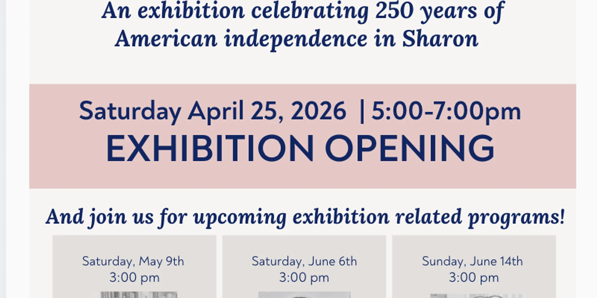 Independence Revisited: Sharon in 1776, 1876 & 1976 Join us on April 25 @ 5:00 pm – 7:00 pm for the exhibition opening of Independence Revisited. By examining Sharon through the lens of three pivotal milestones—1776, 1876, and 1976—the exhibition explores how broader national transformations informed the local experience. Independence Revisited begins with a study of 18th-century life and follows the town’s physical, social, and political trajectory, ultimately investigating how Sharon chose to commemorate, interpret, or overlook its revolutionary heritage during these defining moments in American history.