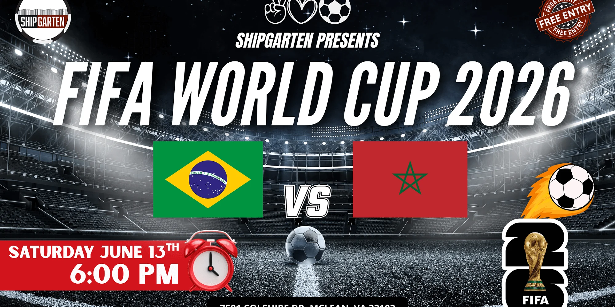 🌎 THE BIGGEST WORLD CUP WATCH PARTY IN TYSONS CONTINUES Samba meets North African fire. Brazil vs Morocco. Saturday night. Prime time energy. And there is no bigger, louder place to experience it than Shipgarten in McLean / Tysons. 🔥 THIS IS HOW YOU WATCH BRAZIL PLAY You don’t watch Brazil quietly. You don’t sip beer calmly. You don’t sit still. You celebrate. Massive screens & stadium-level sound $40 Mix & Match Beer Buckets (5 – 16oz cans) 100+ beer varieties available 4 food concepts in one place All ages welcome (21+ to drink) The loudest World Cup crowd in Tysons If you’re going to watch the World Cup… watch it BIG. ⚽ A MATCH BUILT FOR PRIME TIME Brazil brings flair, rhythm, and five-star legacy. Morocco brings grit, speed, and fearless momentum. Saturday at 6PM? That’s not just kickoff. That’s a party. Arrive early, Brazil matches draw a crowd. 📍 GAME DAY DETAILS 📅 Saturday, June 13th 🕕 Kickoff: 6:00 PM 📍 Shipgarten – 7581 Colshire Dr, McLean, VA 22102 🚗 FREE & large parking at 1700 Old Meadow Rd 🎟 FREE ENTRY – Pay only for what you consume 🍻 Coming with your crew? Upgrade your match day. More Info Click Here The biggest crowd. The coldest beer. The loudest World Cup in Tysons. https://www.eventbrite.com/e/1983896496827?aff=oddtdtcreator