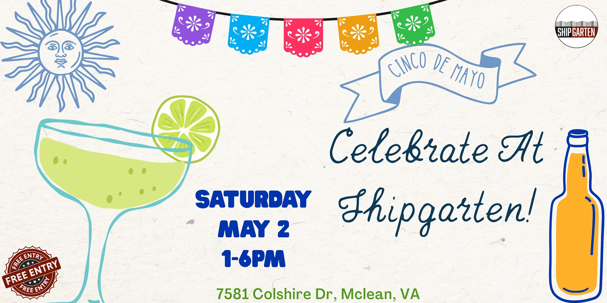 🌮🎉 Cinco de Mayo Festival at ShipGarten 🎉🌮 Get ready to fiesta at ShipGarten’s Cinco de Mayo Festival — a celebration packed with flavor, music, and nonstop fun 🍹🔥 Enjoy sampling a wide variety of drinks, food, compete in festival events for prizes, or take pictures in our photo booth- there’s something for everyone! Shipgarten is 100% dog friendly, whether on-leash or in our off-leash dog park! We offer lots of treats such as Pup Cups and Kongs filled with peanut butter so the whole family can enjoy a treat. ***The restaurant closes at 2 AM*** EVENT SCHEDULE: 2:00 PM – 1800 and Jose Cuervo Tequila Tasting 3:00 PM – Marshmallow to Sombrero Toss ($25 gift card for most marshmallows caught!) 4:00 PM – Hot Pepper Eating Contest (Free T-shirt for winners! Waiver required, 21+ onlyl) ♫ 8 PM – 2 AM Shipgarten After Dark ft. Bianca Diamond💎 8PM – Boxing Watch Party David Benavidez Shipgarten offers 2-155″ TV Walls, 8 TVs, 3 outdoor projectors & 3 indoor to watch ALL big games! ADDITIONALLY: ➳40+ beer & cider samples from local breweries to choose from ➳ Photo Booth with Accessories ➳ Great Food (TACOS ARE BACK) ➳ Frozen Drinks ➳Dog Friendly (Check out our Dog menu, play in the dog park, or just bring your pup along) ➳ Outdoor Games & Activities ➳ Giveaways, Competitions & Prizes ➳ Kids Corner with Face Painting, Moon Bounce, Crafts and more! Drink Specials Jose Cuervo Mexican Tea Shot $5 Jose Cuervo Devil’s Reserve Shot $5 Jose Cuervo Tradicional Margarita $7 1800 Coconut Margarita $7 Cuervo Combo: Shot of Jose Cuervo and Pacifico or Corona Premier on Draft $10 FREE PARKING 1700 Old Meadow Road, McLean, VA 22102 Parking is conveniently located five minutes away by foot and we offer a completely free, pet friendly, and complimentary Shuttle Bus service that runs on a continuous loop to and from the venue and parking lot! Shuttle bus hours: Weekdays 3pm-close Weekends 11am-close Shuttle rides can be requested outside of continuous service hours by calling or texting (703)-712-7481