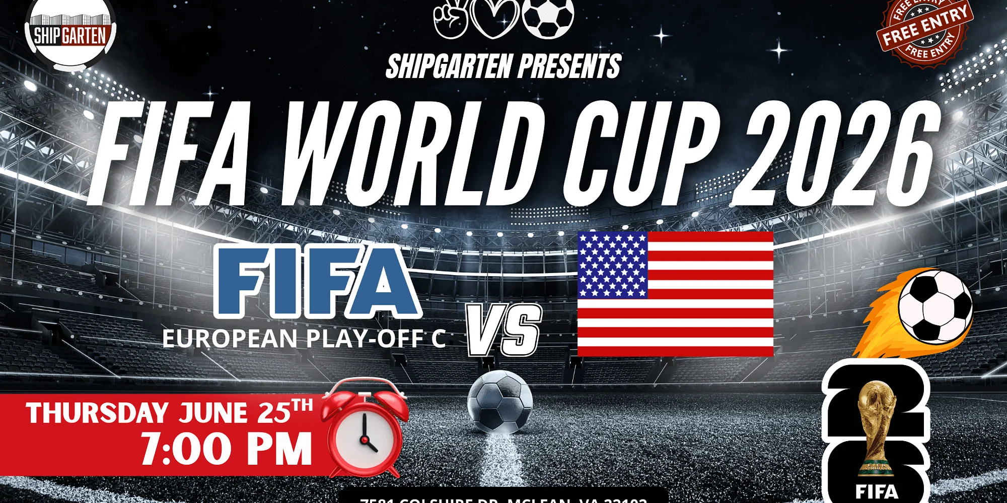 β‘ THURSDAY NIGHT. WIN OR GO HOME. European Play-Off C fights for survival. USA fights for pride. 7PM kickoff. Prime-time intensity. Shipgarten becomes the biggest World Cup watch party in Tysons. π₯ THIS IS HOW YOU WATCH A THURSDAY MATCH You clock out. You show up. You turn the volume all the way up. Massive screens & stadium-level sound $40 Mix & Match Beer Buckets (5 β 16oz cans) 100+ beer varieties available All ages welcome (21+ to drink) The most energetic World Cup crowd in Tysons This isnβt casual viewing. Itβs elimination energy. π PRESSURE BUILDS UNDER THE LIGHTS One side fighting to qualify. One side defending home turf. Thursday night at 7PM means the crowd gets louder as the match gets tighter. Come early. Stay late. Celebrate big. π GAME DAY DETAILS π Thursday, June 25th π Kickoff: 7:00 PM π Shipgarten β 7581 Colshire Dr, McLean, VA 22102 π FREE & large parking at 1700 Old Meadow Rd π FREE ENTRY β Pay only for what you consume π» Coming with your crew? Upgrade your match day. More Info Click Here The biggest crowd. The coldest beer. The loudest World Cup in Tysons.