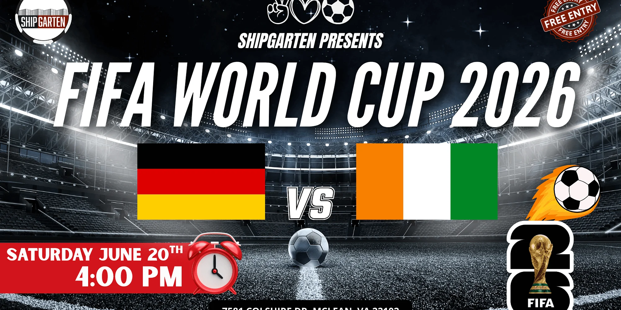 ⚡ SATURDAY. POWER VS SPEED. Germany brings discipline, legacy, and World Cup pedigree. Côte d’Ivoire brings athleticism, strength, and explosive energy. 4PM kickoff. Prime time atmosphere. Shipgarten becomes the biggest World Cup watch party in Tysons. 🔥 THIS IS HOW YOU WATCH A SATURDAY MATCH You show up early. You grab a cold one. You don’t miss a goal. Massive screens & stadium-level sound $40 Mix & Match Beer Buckets (5 – 16oz cans) 100+ beer varieties available All ages welcome (21+ to drink) The most energetic World Cup crowd in Tysons This isn’t a quiet viewing party. It’s full matchday energy. 🏆 TRADITION MEETS FIRE Germany’s structure and precision. Ivory Coast’s intensity and pace. Saturday afternoon at 4PM means momentum builds into the night. Come early. Stay late. Celebrate big. 📍 GAME DAY DETAILS 📅 Saturday, June 20th 🕛 Kickoff: 4:00 PM 📍 Shipgarten – 7581 Colshire Dr, McLean, VA 22102 🚗 FREE & large parking at 1700 Old Meadow Rd 🎟 FREE ENTRY – Pay only for what you consume 🍻 Coming with your crew? Upgrade your match day. More Info Click Here The biggest crowd. The coldest beer. The loudest World Cup in Tysons. https://www.eventbrite.com/e/1983979049745?aff=oddtdtcreator