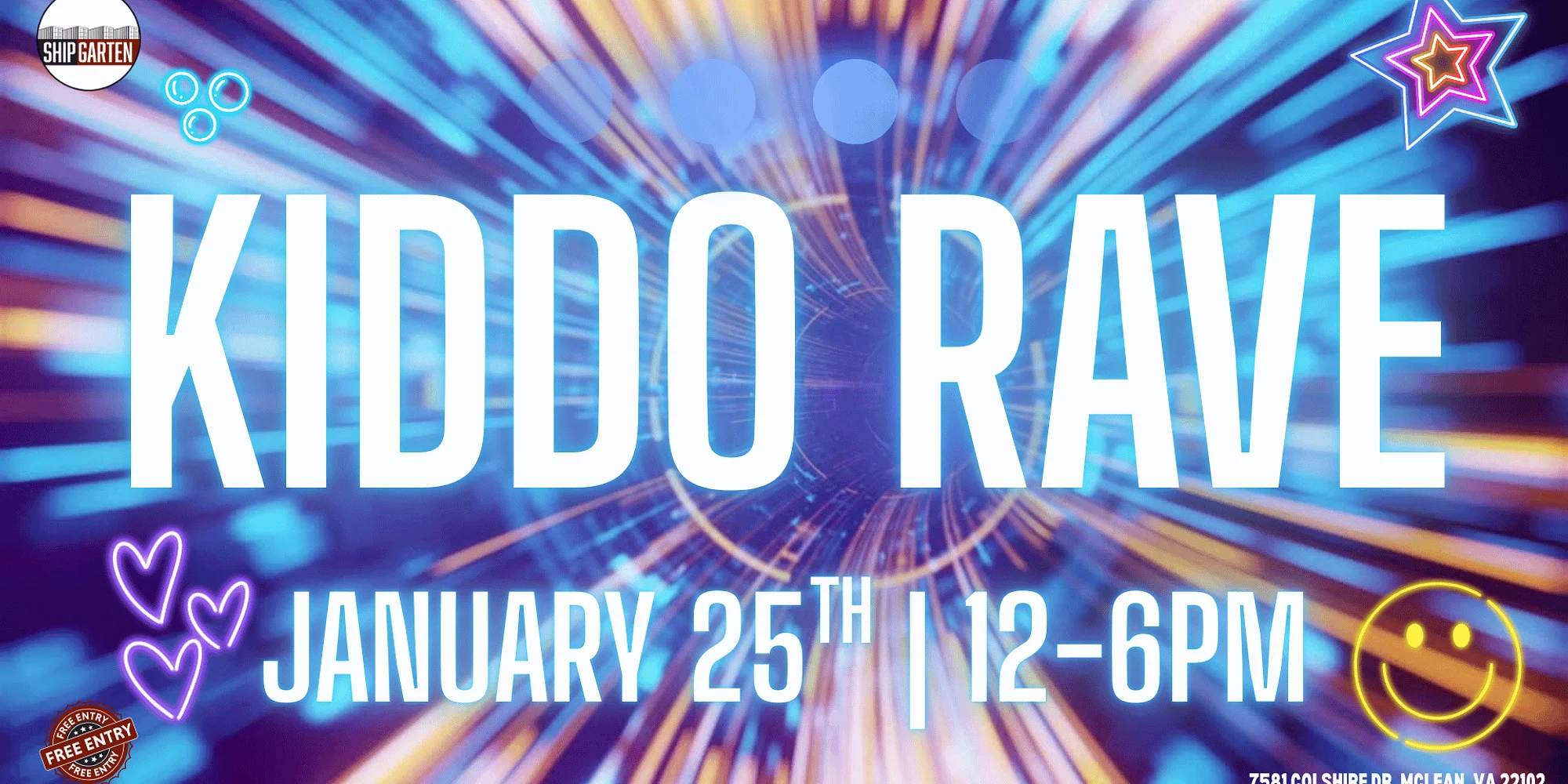 Turn up the fun at Kiddo Rave — a daytime dance party made just for kids and families! Join us at Shipgarten on January 25th from 12–6PM for an afternoon filled with music, movement, and nonstop smiles. 🕺💃 This kid-friendly rave features upbeat music, colorful lights, and an exciting atmosphere designed for little partygoers to dance, play, and let loose in a safe, family-friendly environment. Parents can relax and enjoy Shipgarten’s food, drinks, and spacious outdoor setup while the kids burn off energy. 🎶 What to Expect: • Kid-friendly dance music & rave-style vibes • Fun lights, upbeat energy & interactive fun • Family-friendly environment • Food, drinks & craft beer available for parents EVENT SCHEDULE: 12-3pm: Balloon animals and magic tricks 1pm: Magic Show by Jake the Great 12-6pm Kiddo Rave with Bianca Diamond 12-6pm Face Paint, Arts & Crafts, Moon Bounces 📍 Shipgarten 7581 Colshire Dr, McLean, VA 22102 🅿️ Free Parking: 1700 Old Meadow Rd 🎟 Free Entry Grab your glow gear and get ready to dance — Kiddo Rave is bringing the energy! 💥