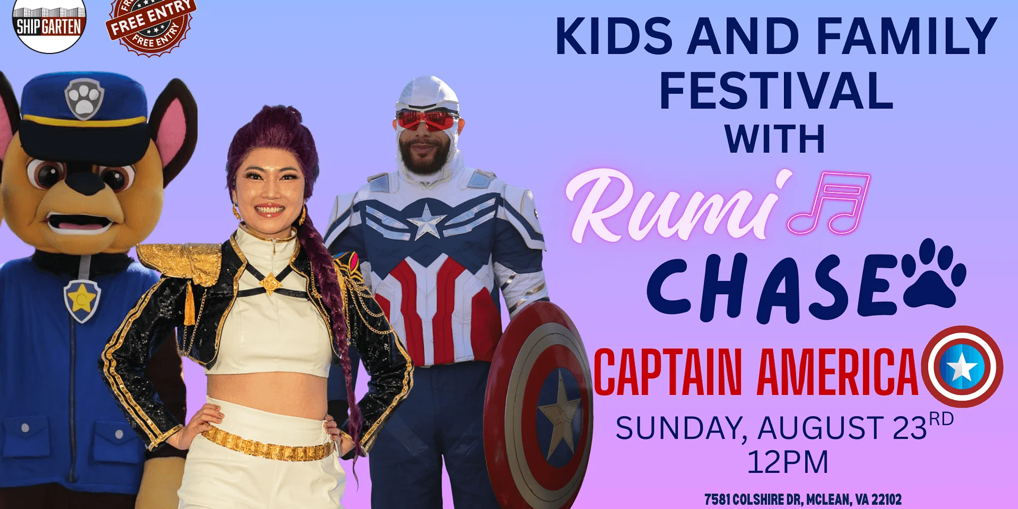Get ready for an action-packed day of heroes, pups, and pop-star power! 🌟🐾🦸 Join us at **Shipgarten’s Kids & Family Festival** on **August 23rd** for an unforgettable adventure featuring **Rumi from Kpop Demon Hunters, Chase from Paw Patrol, and Captain America**! Bring the whole family out for epic meet & greets, high-energy dance parties, interactive games, and tons of kid-friendly fun. Whether your little one is ready to save the day, go on a rescue mission, or dance like a K-pop star, this festival has something for every hero in training! 🎉 Character appearances & photo ops 🎶 Family dance party 🎨 Fun activities & games 🍔 Delicious eats & drinks for parents, too Mark your calendars — it’s going to be a super-powered Saturday you won’t want to miss! 💥✨