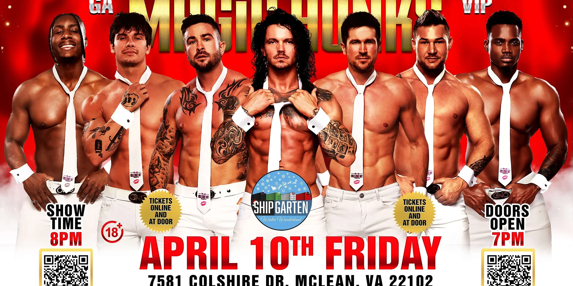 Don’t Miss AUSTRALIA’S Ultimate Girls’ Night Out! Grab Your Tickets Now for a Night Full of Fun, Excitement, and Unforgettable Memories. Australia’s Biggest ladies night is coming to Shipgarten on Friday April 10th Showtime 8pm!! Catch the HUNKS for a breath-taking performance like none other! McLEAN ARE YOU READY?! The Magic Hunks Australia WORLD TOUR is hitting McLean,VA.This is your chance to witness the Ultimate,high energy,jaw dropping,pulse-racing male revue show LIVE! Expect an all-star lineup, heart racing performance,and electrifying stage presence that will leave you breathless and begging for more! Whether you’re celebrating a Birthday, Bachelorette, Divorce, Dirty Thirty or your own Sheer Awesomeness, you don’t want to miss the most exciting ladies night out of the year! So Girls come MISBEHAVE in an empowering, fun-filled evening created just for you and embark on an unforgettable night of Fun & Excitement! After all, you deserve a night out with your girlfriends. So what are you waiting for! SHOW SCHEDULE 6:30PM -VIP ENTRY 7PM – Doors Open 8PM Showtime 10:30PM -Show Over +Meet N Greet VIPS and Photo with Cast Round up your party Squad for the ULTIMATE Girls’ Night Out! Get Ready for a night Packed with jaw -dropping entertainment,cheeky surprise,and non-stop fun! TICKETS ARE SELLING FAST-DON’T MISS THE BEST GIRLS NIGHT EVER! Secure yours,Now and experience MAGIC HUNKS Australia WORLD TOUR LIVE! IMPORTANT REMINDERS Arrive 30 min early to check in and avoid long lines. Line Up Disclaimer:MAGIC HUNKS reserves the right toadjust performer roster based on availability Effects Notice: The Show may include flashing lights and strobe effects Don’t Miss Out! Book your ticketss now for a night that promises to be fun and unforgettable! TIKTOK@GIRLSNIGHTOUTLIVE NOTE: Tickets are non-refundable unless the show gets canceled. In some circumstances, the show might be rescheduled; the previously purchased tickets will be honored on the new date. In cases of rescheduling, we will inform you via email.