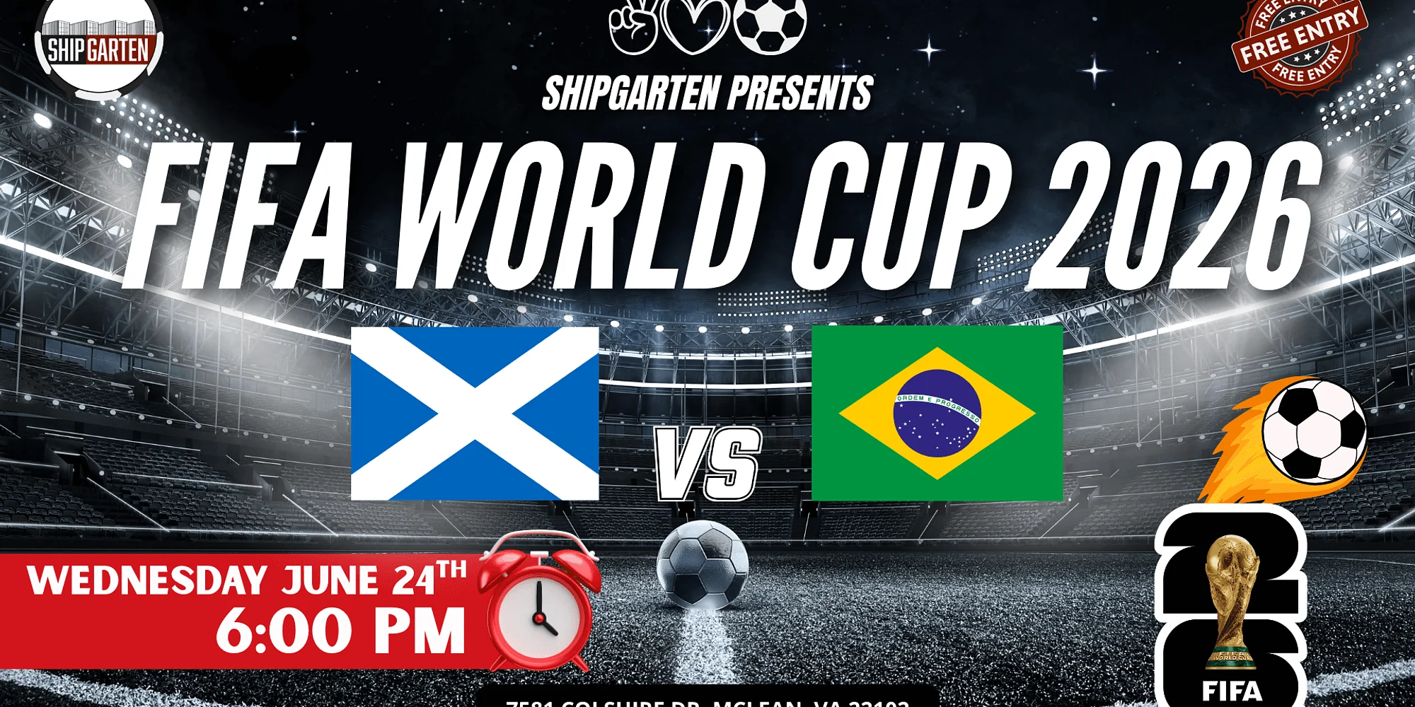 🔥 MIDWEEK CLASH. PASSION VS POWER. Scotland brings heart, grit, and fearless fight. Brazil brings flair, rhythm, and world-class magic. 6PM kickoff. After-work energy turns into full matchday chaos. Shipgarten becomes the biggest World Cup watch party in Tysons. 🔥 THIS IS HOW YOU WATCH A WEDNESDAY MATCH You clock out. You grab a cold one. You don’t miss kickoff. Massive screens & stadium-level sound $40 Mix & Match Beer Buckets (5 – 16oz cans) 100+ beer varieties available All ages welcome (21+ to drink) The most energetic World Cup crowd in Tysons This isn’t background TV. This is full stadium energy. 🏆 TRADITION MEETS SAMBA Scotland’s pride and pressure. Brazil’s creativity and attacking firepower. 6PM means the crowd builds fast. Goals hit harder at night. Come early. Stay loud. Celebrate big. 📍 GAME DAY DETAILS 📅 Wednesday, June 24th 🕛 Kickoff: 6:00 PM 📍 Shipgarten – 7581 Colshire Dr, McLean, VA 22102 🚗 FREE & large parking at 1700 Old Meadow Rd 🎟 FREE ENTRY – Pay only for what you consume 🍻 Coming with your crew? Upgrade your match day. More Info Click Here The biggest crowd. The coldest beer. The loudest World Cup in Tysons.
