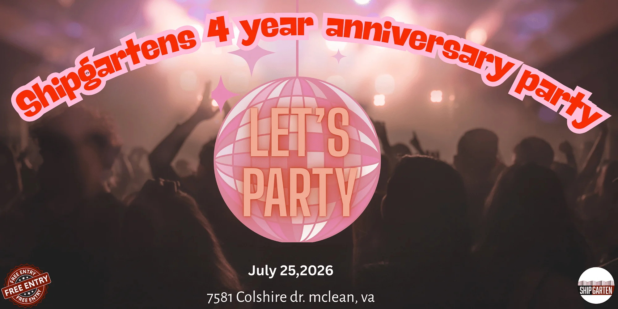 🎉🥂 Shipgarten 4 Year Anniversary Celebration 🍻 Four years. Countless memories. One epic celebration. Join us as we celebrate 4 incredible years of Shipgarten — the drinks, the music, the community, and all the unforgettable nights we’ve shared together. Celebrate three years of Shipgarten magic at our anniversary party on Saturday. Join us at Shipgarten for an unforgettable day filled with laughter, excitement, and community spirit. Take a plunge into fun with our dunk tank, where you can cool off and make a splash. There’s something for everyone to enjoy at Shipgarten’s 4-year anniversary bash. Don’t miss out on the festivities as we toast to three years of memories and look forward to many more to come! ***Shipgarten opens at 11 AM & the party goes ALL DAY The restaurant closes at 2 AM*** Event Schedule: 1-6PM DUNK THE OWNERS 3PM Ceremonial Keg Tap 2-3PM Anniversary Games Minute Jenga Hot Dog Eating Contest Stein Hoisting 6PM Water Balloon Fight 3:30-7:30PM Live Music 8PM Silent Disco with Bianca Diamond But that’s not all! we offer (2) 155″ TV Walls, 8 TVs, 2 outdoor projectors, and 3 indoor projectors, ensuring you won’t miss any of the big games. ADDITIONALLY: ➳40+ beer & cider samples from local breweries to choose from ➳ Photo Booth with Accessories ➳Great food ➳Dog Friendly (Check out our Dog menu, play in the dog park, or just bring your pup along) ➳ Outdoor Games & Activities ➳ Giveaways, Competitions & Prizes ➳ Kids Corner with Face Painting, Moon Bounce, Crafts, and more!