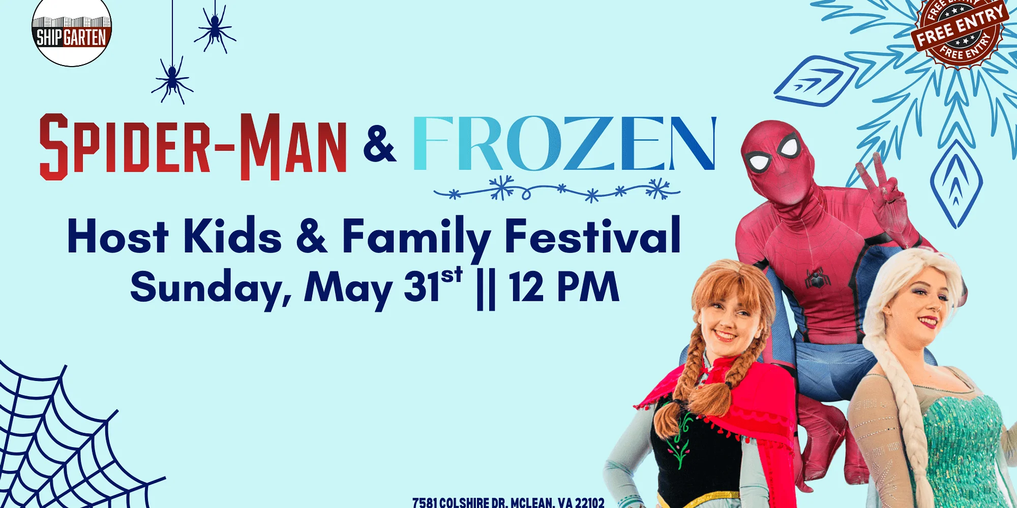 A royal adventure meets superhero action! Join us at **Shipgarten’s Kids & Family Festival** on **Sunday 5/31** for a magical day featuring special appearances by **Frozen’s favorite snow queen & princess** and everyone’s favorite web-slinging hero, **Spiderman**! Bring the whole family for an afternoon packed with kid-friendly activities, music, games, delicious eats, and unforgettable photo ops with your little ones’ favorite characters. Whether your crew loves ice castles or skyscrapers, this is one festival you won’t want to miss! Shipgarten Sunday 5/31 Family fun all day long
