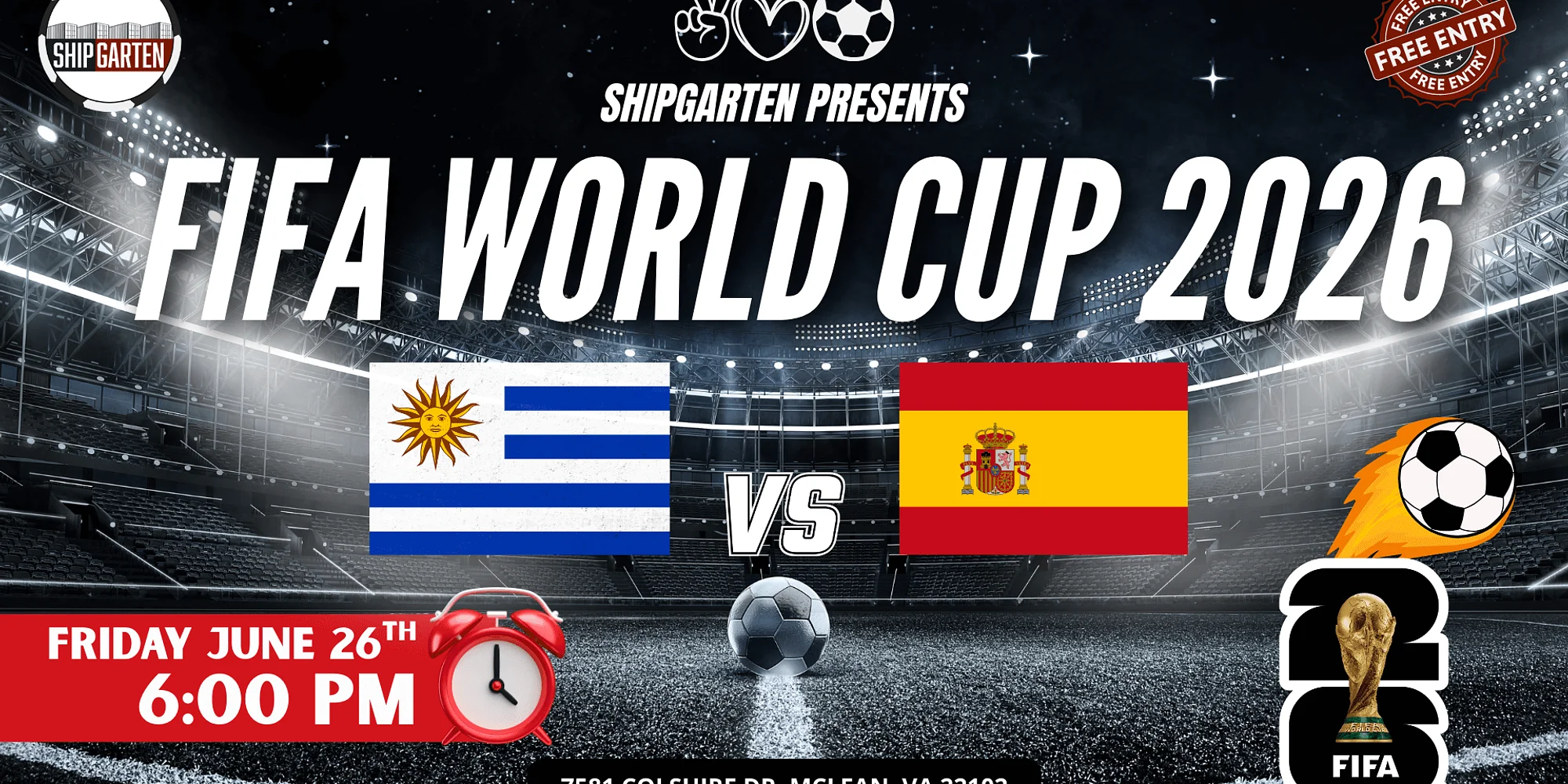 🔥 FRIDAY NIGHT. HISTORY VS PASSION. Uruguay brings grit, legacy, and World Cup history. Spain brings possession, precision, and technical dominance. 6PM kickoff. Prime after-work energy. Shipgarten becomes the biggest World Cup watch party in Tysons. 🔥 THIS IS HOW YOU DO FRIDAY SOCCER You clock out. You show up. You grab a cold one. You don’t miss kickoff. Massive screens & stadium-level sound $40 Mix & Match Beer Buckets (5 – 16oz cans) 100+ beer varieties available All ages welcome (21+ to drink) The most energetic World Cup crowd in Tysons This isn’t background noise. This is full match energy. 🏆 SOUTH AMERICAN FIRE VS EUROPEAN CONTROL Uruguay’s intensity and tradition. Spain’s rhythm and tactical mastery. Friday at 6PM means the night is just getting started. Come early. Stay late. Celebrate big. 📍 GAME DAY DETAILS 📅 Friday, June 26th 🕛 Kickoff: 6:00 PM 📍 Shipgarten – 7581 Colshire Dr, McLean, VA 22102 🚗 FREE & large parking at 1700 Old Meadow Rd 🎟 FREE ENTRY – Pay only for what you consume 🍻 Coming with your crew? Upgrade your match day. More Info Click Here The biggest crowd. The coldest beer. The loudest World Cup in Tysons.