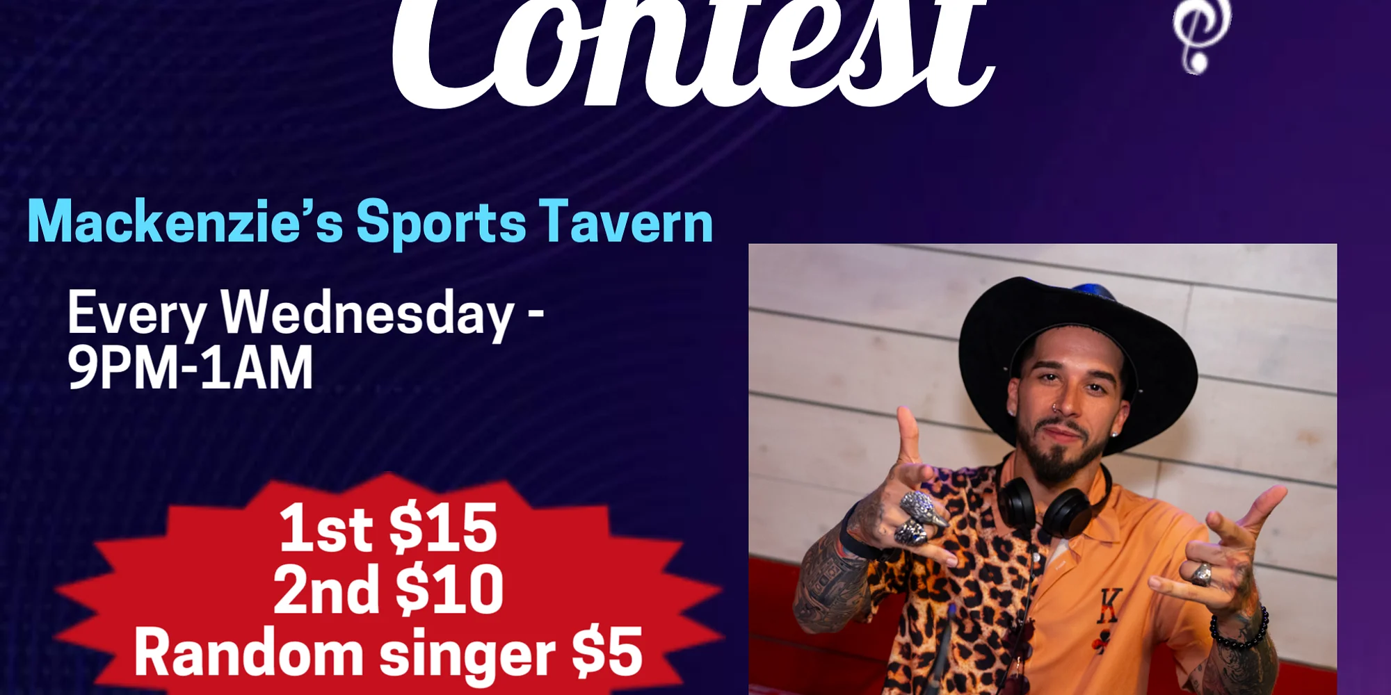 Wednesday night karaoke at Mackenzie’s sports tavern in south Tampa I’m there 9pm-1am we got free to play pool til 2am and $10/10 wings I also give out prizes to singers and have a 50/50 raffle