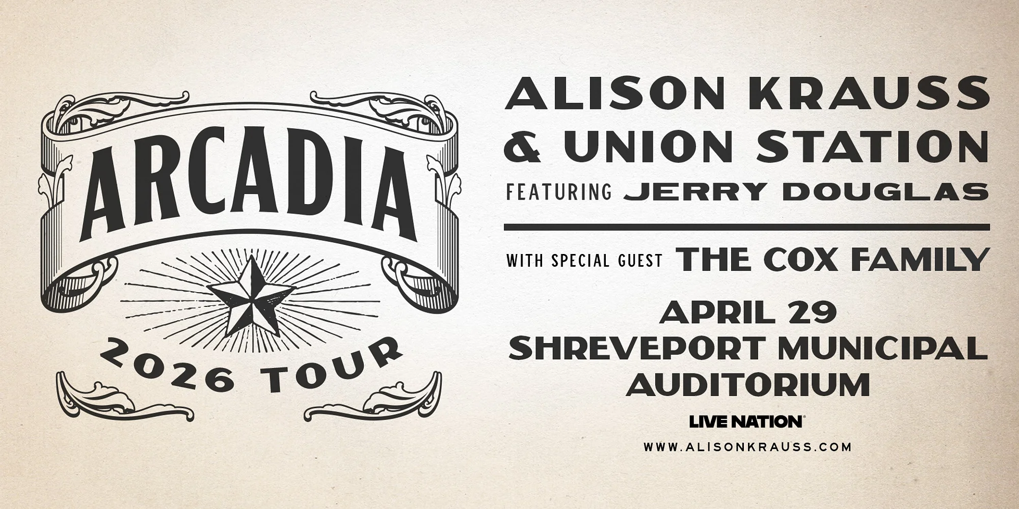 Tickets Alison Krauss& Union Station featuring Jerry Douglas are bringing their Arcadia 2026 tour to the Shreveport Municipal Auditorium! With special guests THE COX FAMILY!
