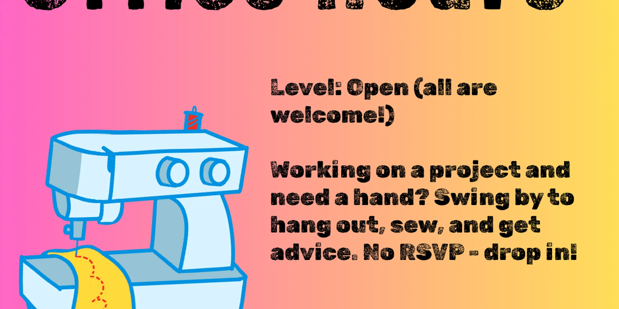 Sewing! Drop In Office Hours Feb 9, 10, 12, 13 | 5:30-7p March 16, 17, 19, 23, 24, 26 | 5:30-7p *ends promptly at 7p to accommodate the classes that follow! $10-25 sliding scale per drop-in day Working on a project that you could use a hand with? Wish you could ask someone in-person for sewing advice? Now you can! Swing by for any of these office hours to hang out with kind, creative people and ask Meagan for sewing advice! No RSVP or registration in any other course required for dropping-in, just come on by! Pay when you drop in: Cash, Card, Venmo