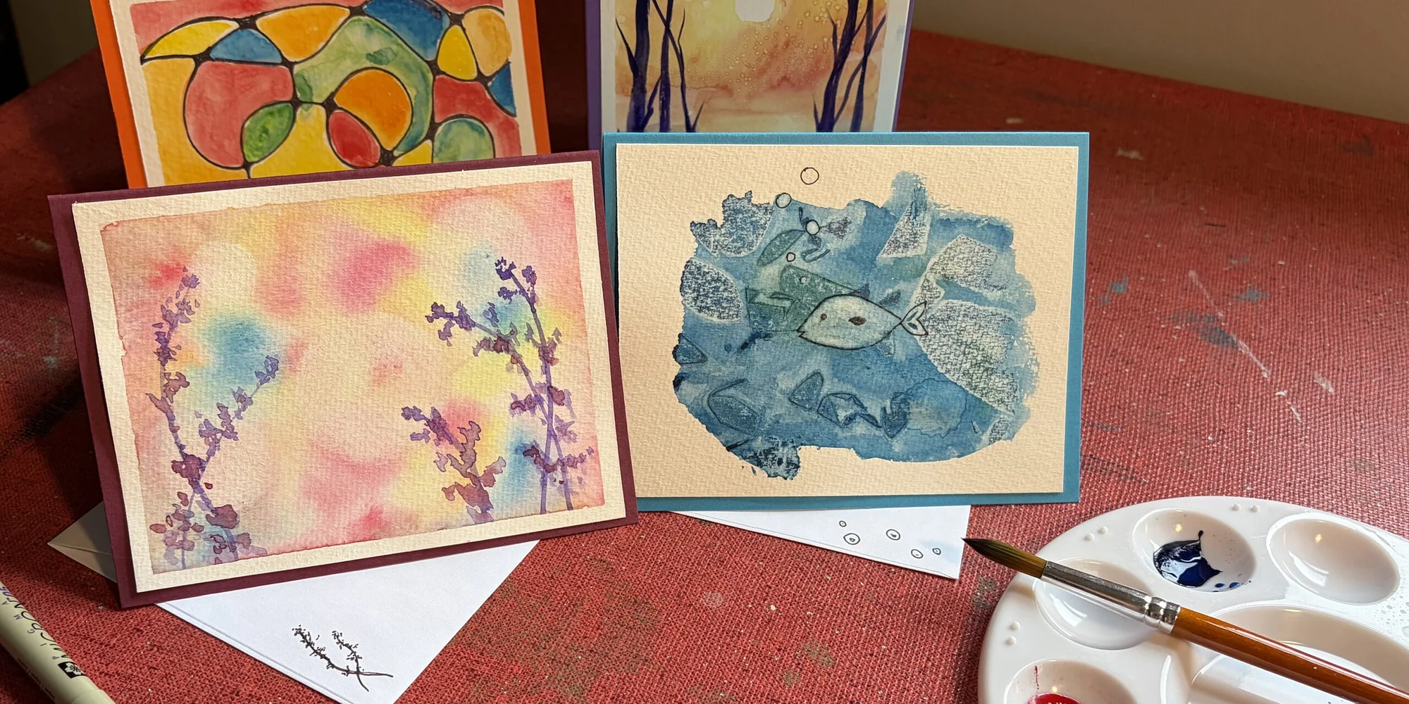 Join us for a fun watercolor class for the beginner or experienced artist. I will teach 4 different techniques, and you will leave with 4 completed and unique cards! A great activity for friends or parent/child (over age 10 please). All materials provided.