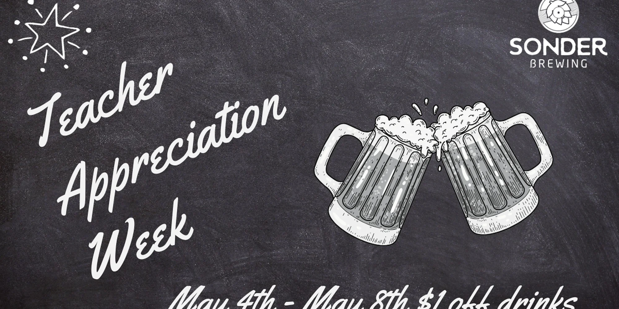 Teacher Appreciation Week at Sonder Brewing We’re raising a glass to all the amazing educators in our community! Join us at Sonder Brewing (BOTH LOCATIONS) as we celebrate Teacher Appreciation Week with some well-deserved fun. $1 Drinks for Teachers Prizes all week long - Tag a teacher and be entered into our online raffles for prizes! Whether you're wrapping up the school day or kicking off the weekend, this is your time to relax, connect, and be celebrated. Bring your teacher ID and enjoy a week full of appreciation, good vibes, and great beer. You’ve earned it — we’ll see you there! Learn more INVITE A FRIEND