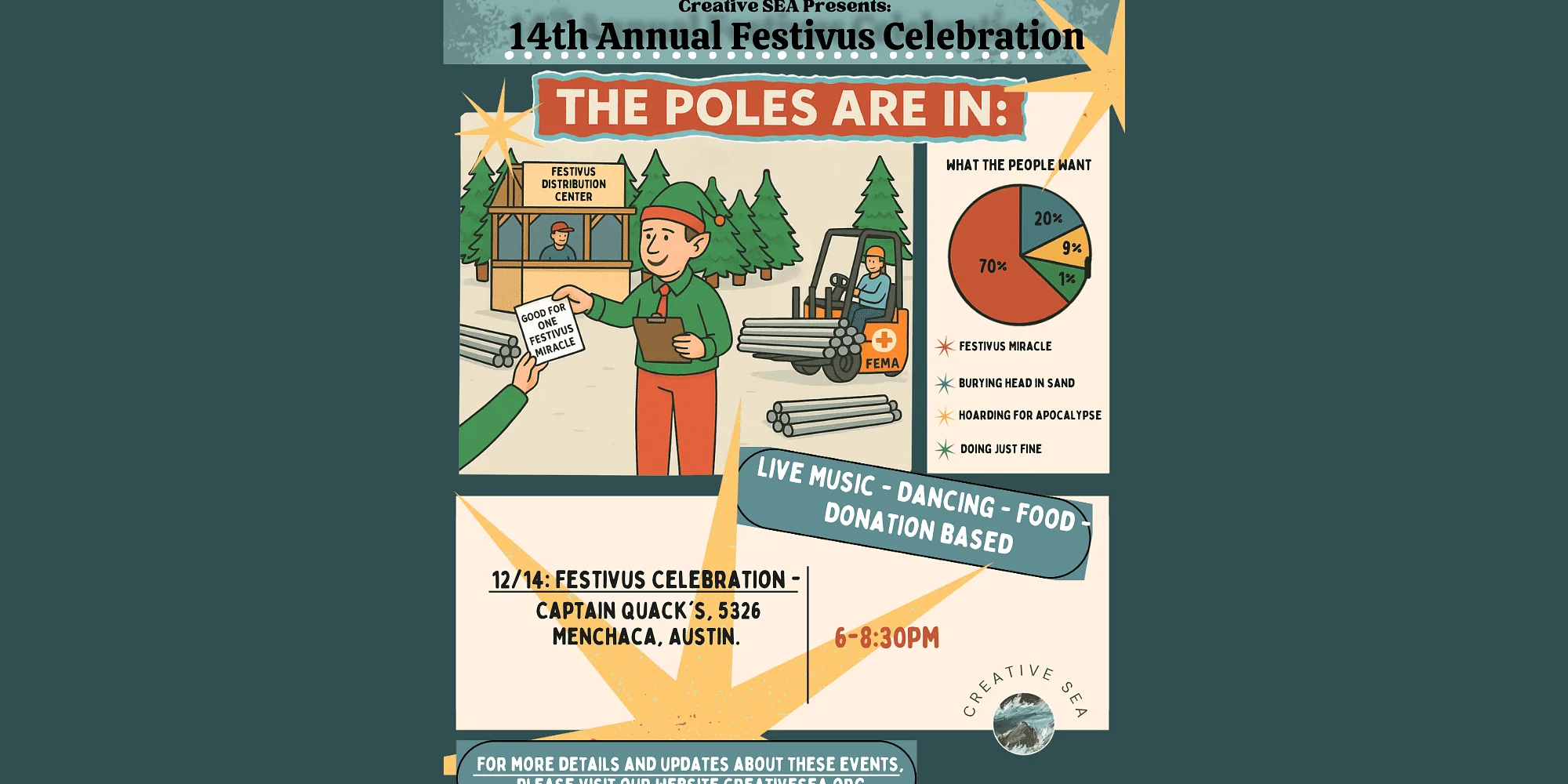 Join us for our annual Festivus! When the stress of the holidays starts to get you down, it’s time for Festivus, a rollicking multicultural variety show of music, dance, and humor. Paul Klemperer & The Festivians perform classic Jazz, Pop & Soul songs with a cavalcade of special guests. And, of course, the Airing Of Grievances! This project is supported in part by the City of Austin Economic Development Department. Find out more at CreativeSEA.org Doors 6 pm Show 6:30 pm