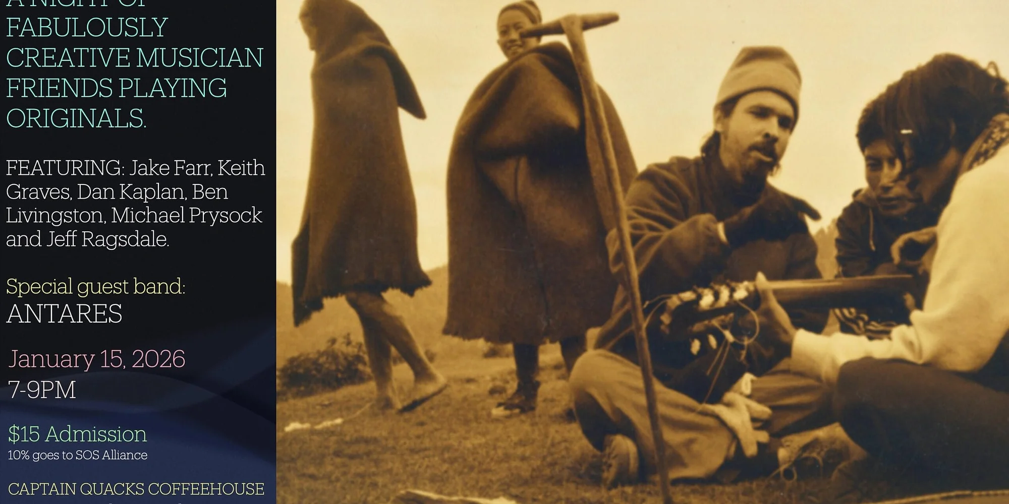 Join us for a fabulous evening Ben Livingston, Emcee, songwriter and frontman of Shigidee Shigidee, takes the Quack’s stage again as a great entertainer whose wry intelligence, emotional depth, and vivid sense of place shape songs that feel like finely crafted stories lived long before they were written. Jake Farr stands out as a musician whose craft is grounded in serious classical training yet delivered with genuine heart and clarity. He writes songs with both thought and feeling, offering a contemplative style that trades flash for depth and rewards anyone willing to lean in and listen closely. As the host of the mighty Cactus Café Open Mic, Jake also plays a huge role in nurturing Austin’s songwriter community, giving countless artists a place to grow, be heard, and feel at home. Keith Graves is a South Austin musician-artist whose deep well of influences and visual-arts imagination make him a true rock-soul alchemist, blending funk, grit, and storytelling into a style that feels both timeless and unmistakably his. Dan Kaplan plays harmonica like it’s a whole symphony, deeply soulful and crafted with elements of the human condition that makes his sound instantly recognizable. His playing evokes emotion that draws listeners in before they even realize it’s happening. Michael Prysock has that gritty, believable voice and a storyteller’s way with songs, honest, lived-in tunes you remember, and you can find him most Tuesday nights holding court as a Cactus Café regular. Jeff Ragsdale His time in the Whitney ISP sharpened his eye for composition and nuance, and you can hear that same visual intelligence in his playing, melodies distinctly his, that unfold like brushstrokes, each note placed with an artist’s patience and a painter’s instinct for story. SPECIAL GUEST BAND: ANTARES Barton Springs’ loveliest band and possibly the only group in Austin proven to ignite instant oxytocin in an audience. When Antares plays, crowds spontaneously break into smiling, dancing, hugging, and occasionally floating an inch above the floor. Featuring: Mohammad Firoozi of Atash, bringing masterfully woven Persian, Latin, and world-soul guitar lines that feel like sunrise over your favorite lifetime. R.P. Watson Renowned Barton Springs pan drum virtuoso. His steel pan isn’t just an instrument; it’s a portal. One note and suddenly everyone is barefoot. Lance Harris groove master on guitar and percussion. Lance lays down a pulse that rearranges your heartbeat in the best possible way. Ben “One Chord” Livingston on tenor-guitar-percussion. A whole rhythm section in one chord. Hypnotic, percussive, playful, like a friendly shaman tapping the floorboards until everybody levitates. When Antares plays, joy becomes contagious, and strangers turn into dance partners. Come for the music. Stay for the friendships. Leave with a heart two sizes bigger. Doors 6:30 Show 7pm