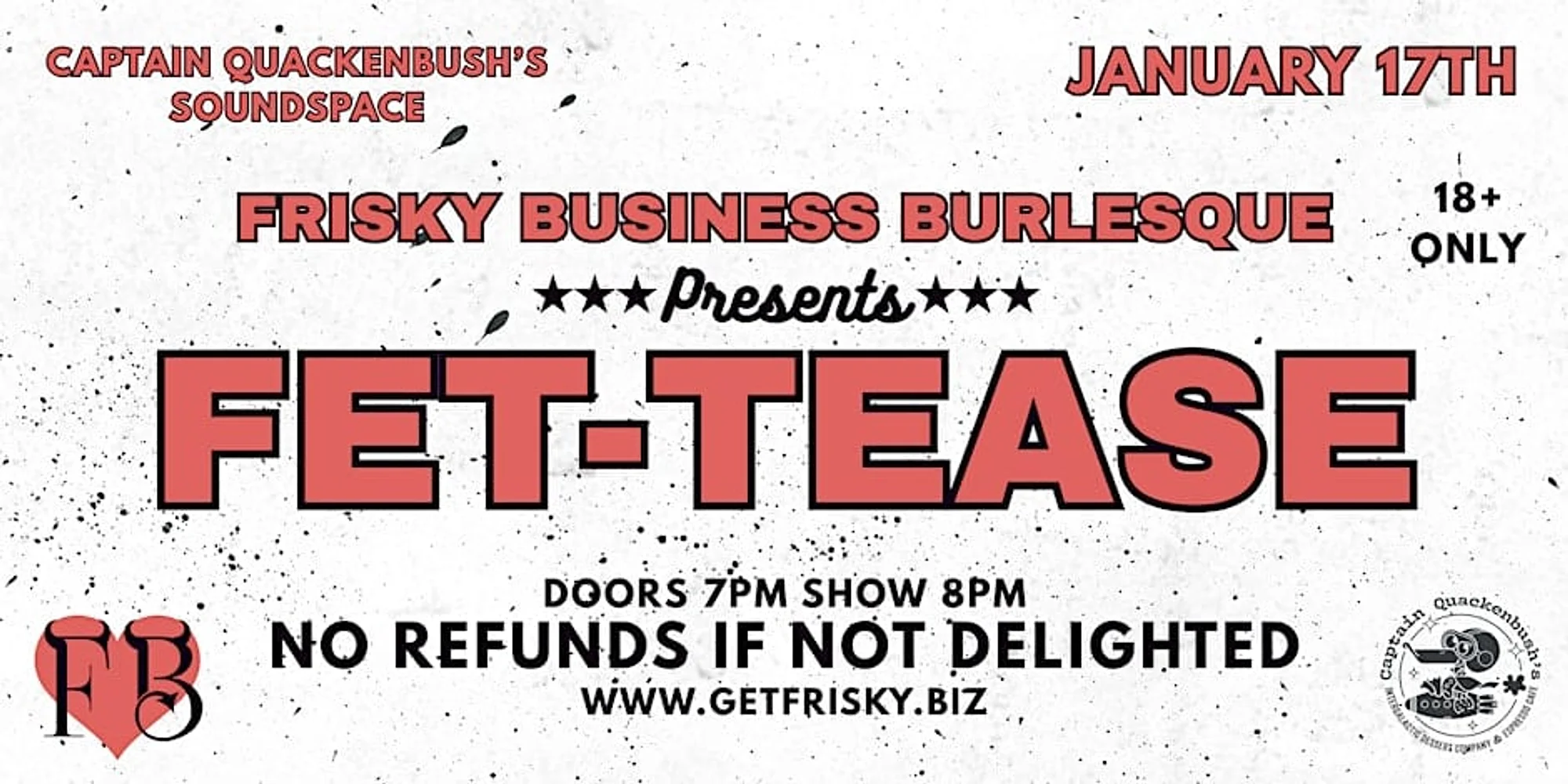 Come tickle your senses at a production of fetish-inspired seduction! Bring out your inner voyeur at the 11th Annual Frisky Fet-Tease! Since 2013 the devilish minds of Frisky Business Burlesque have been putting on a winter show celebrating the deliciously diverse world of kink with burlesque, drag, performance art, choreography, acro/pole, shock, and shimmy! Enjoy a special drink menu crafted by the Quack’s staff, vendors, exclusive Frisky Merch, and raffle prizes! Featured Friskies: Ryder Strong Stella Belle Brandy Knight Jack Rabid Val Royalle Jojo Jezebel Coco Kitty Hosted by CanDeStroy Saturday, January 17 Captain Quackenbush’s Soundspace 7pm Doors 8pm Show 18+ ONLY
