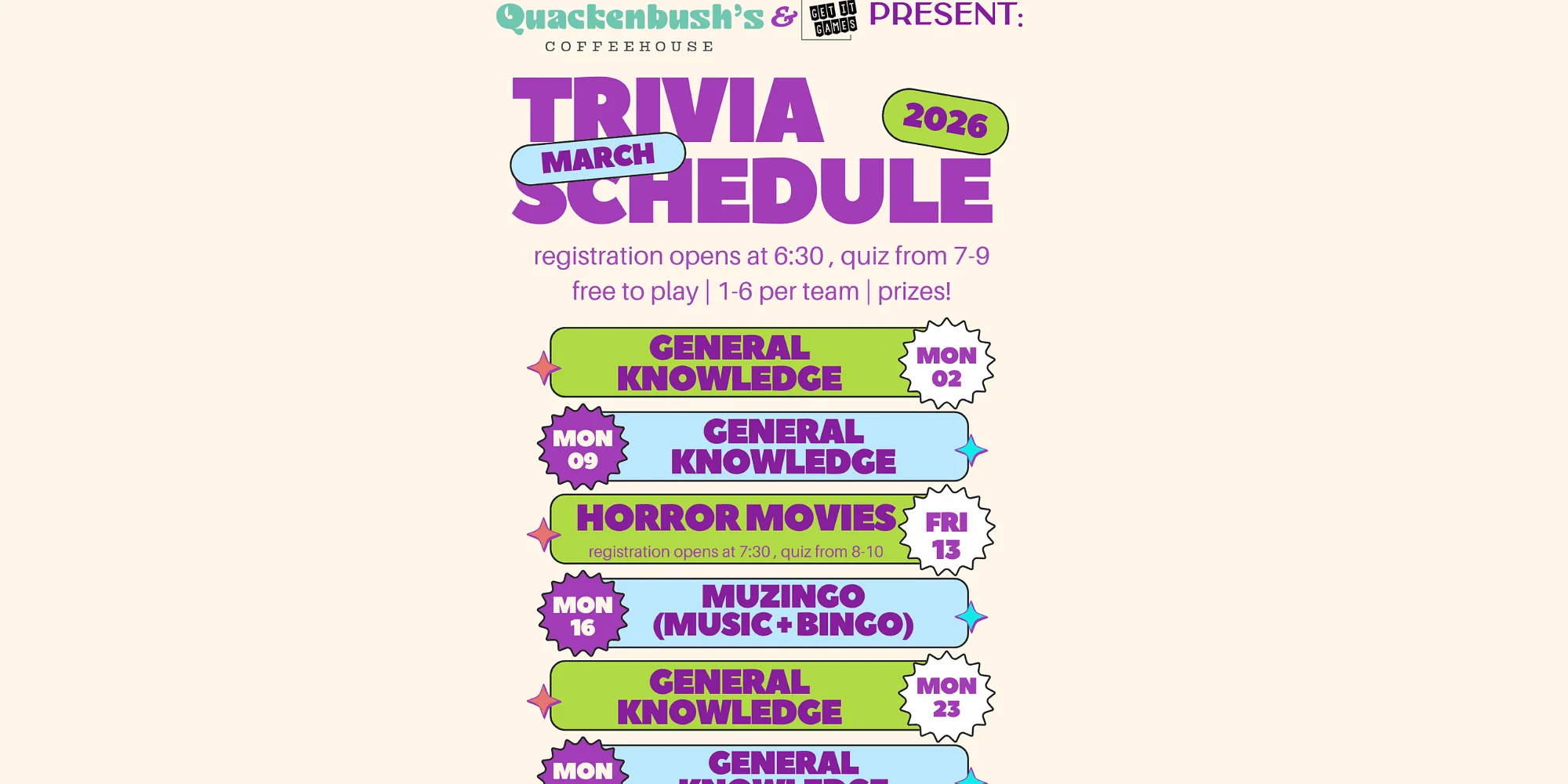 Come join us for a special music bingo night MUZINGO WITH GET IT GAMES! Come join us at Captain Quackenbush’s Coffeehouse for a fun-filled evening of MUSIC BINGO! Test your knowledge on all things while enjoying delicious coffee, snacks and cocktails! Gather your friends to compete against others for the title of muzingo champions. See you there! Sign up starts at 6:30 Game from 7pm to 9pm