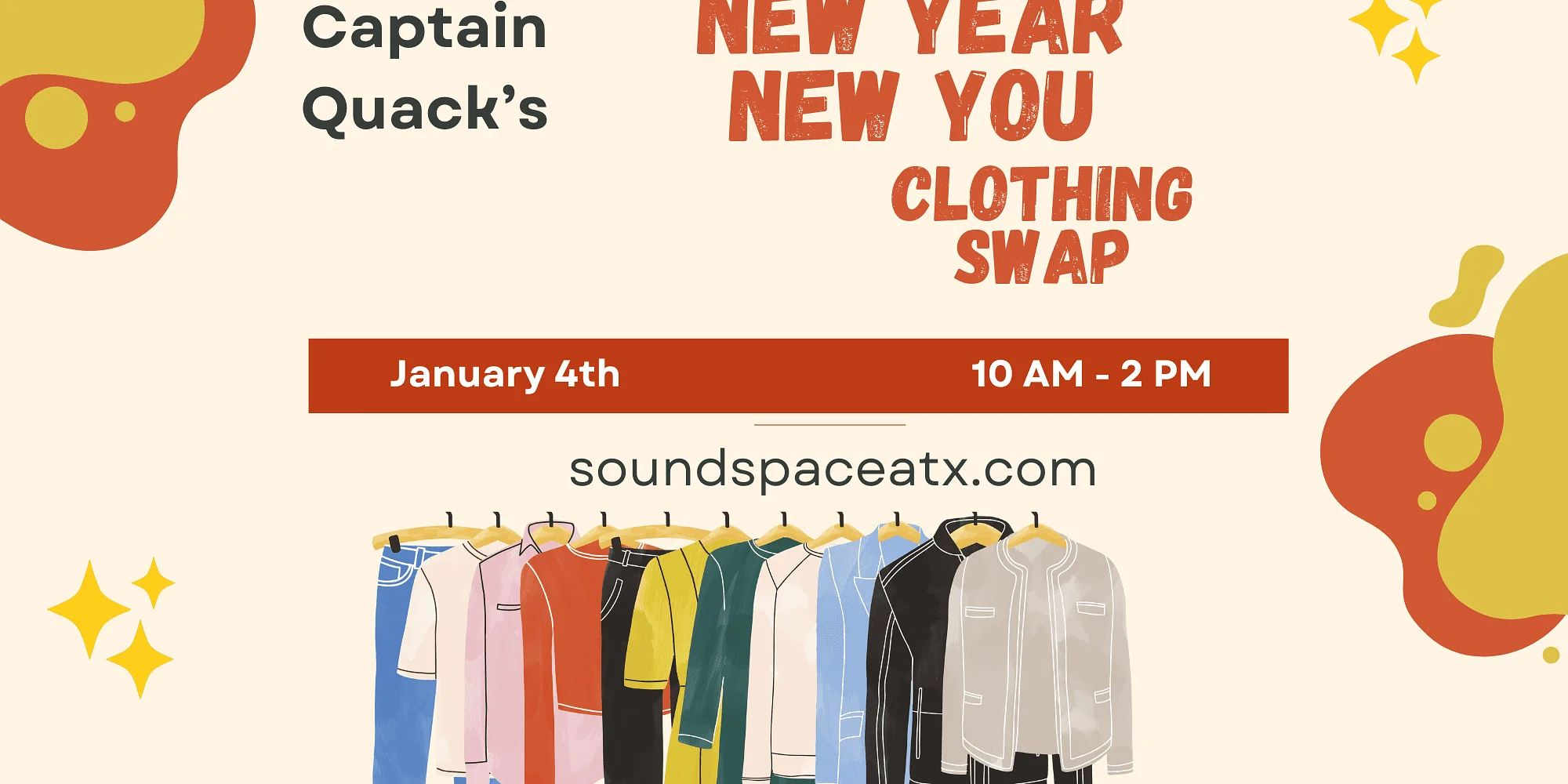 Get ready to swap out your gently used clothes for some fresh new styles at our New Years Clothing Swap event! Clothing Swap! Come join us at Captain Quack’s Coffeehouse for a fun and eco-friendly event! Bring up to 1 bag of your gently used clothes that you no longer wear and swap them for some new-to-you treasures. It’s a great way to refresh your wardrobe without spending a dime. Plus, it’s a fantastic opportunity to mingle with fellow fashion enthusiasts and maybe even make some new friends. Don’t miss out on this chance to declutter your closet and score some stylish finds! 10AM TO 2 PM All left over clothes will be donated to SAFE. Please do not bring more than 1 bag : )