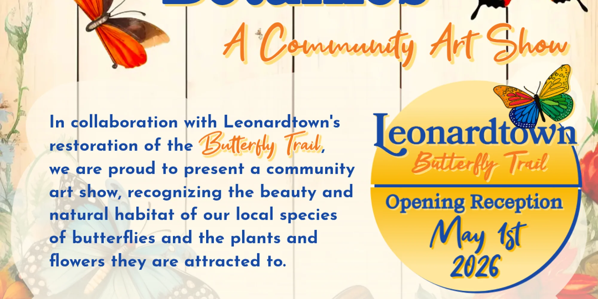 Join us for the Opening Reception on First Friday, May 1st, 2026 at St. Mary’s County Arts Council Gallery & Gift Shop from 5 - 8 PM. This event is in collaboration with the re-launch of the Butterfly Trail Project in Leonardtown. Meet the artists and see their work! Submit your artwork for Butterflies & Botanics by Friday, April 10th at 11:59 PM! Artists of all ages from St. Mary’s, Calvert, and Charles County may enter a piece! Click here for the full guidelines and submission instructions. Artwork will be featured for the month of May, including at the Opening Reception on First Friday, May 1st, at St. Mary’s County Arts Council Gallery & Gift Shop.