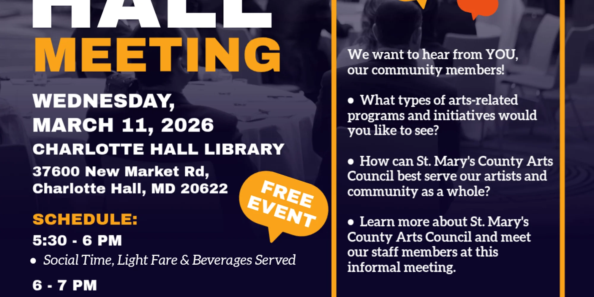 Join us at our next Town Hall Meeting at Charlotte Hall Library! Location: 37600 New Market Rd, Charlotte Hall, MD 20622 Date: Wednesday, March 11, 2026 Time: 5:30 - 6 PM light fare and beverages served and social time, 6 - 7 PM Town Hall Meeting. We want to hear from YOU, our community members! * What types of arts-related programs and initiatives would you like to see? * How can St. Mary’s County Arts Council best serve our artists and community as a whole? * Learn more about St. Mary’s County Arts Council and meet our staff members at this informal meeting. Be sure to contact us by Sunday, March 8th at 11:59 PM to reserve your spot and join us for a pizza dinner. Click here to learn more and to RSVP! Questions? Email info@smcart.org or call 240-309-4061