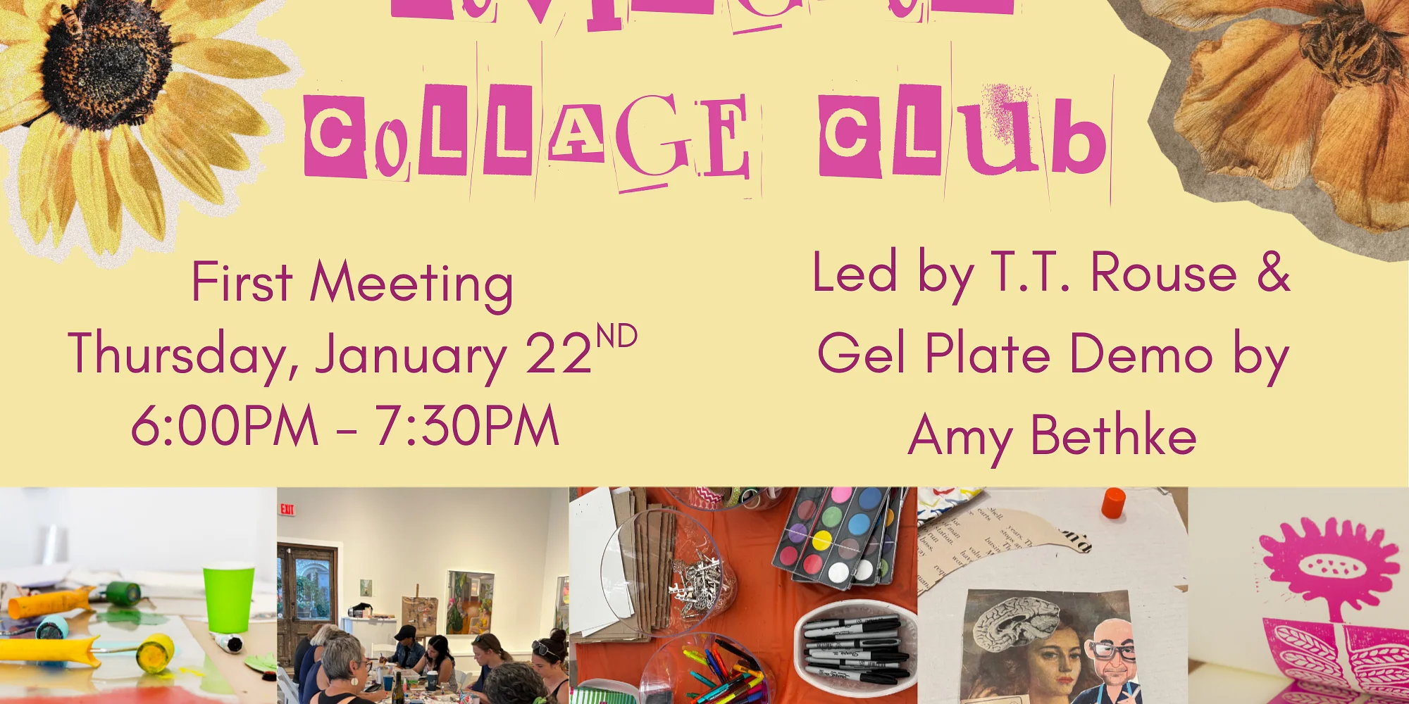 First meeting of the covington collage club is thursday, january 22nd from 6:00pm - 7:30pm Join our first ever session of the CCC! Each club meeting will offer a brief collage tutorial followed by lots of fun with paper and glue! Feel free to bring any projects or materials you wish to work on. Sharing of ideas, tops, and supportive feedback with the group is encouraged. We will have plenty of ephemera and supplies on hand. All ages welcomed, and experience is not required! In our January meeting, Amy Bethke will demonstrate gel plate techniques to create hand-printed collage papers! Learn more here!