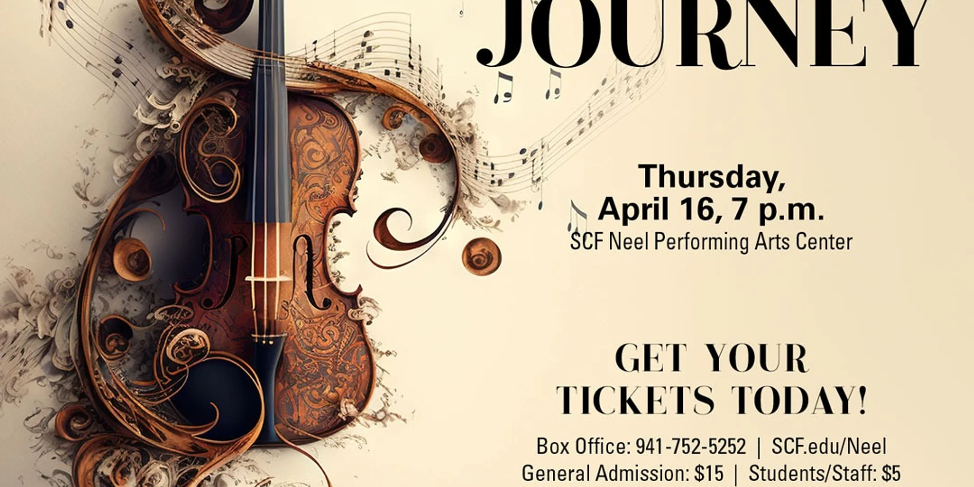 Presented by SCF Bradenton Symphony Orchestra Thursday, April 16th @ 7:00 p.m. SCF Bradenton Campus, 5840 26th St. West, Neel Performing Arts Center, Bldg. 11 East Embark on A Musical Journey with the SCF Bradenton Symphony Orchestra. This unforgettable evening invites you to experience a rich and diverse program that travels across time, style, and emotion. Join us as our talented student musicians bring each piece to life, guiding you through a powerful exploration of orchestral sound. BUY TICKETS