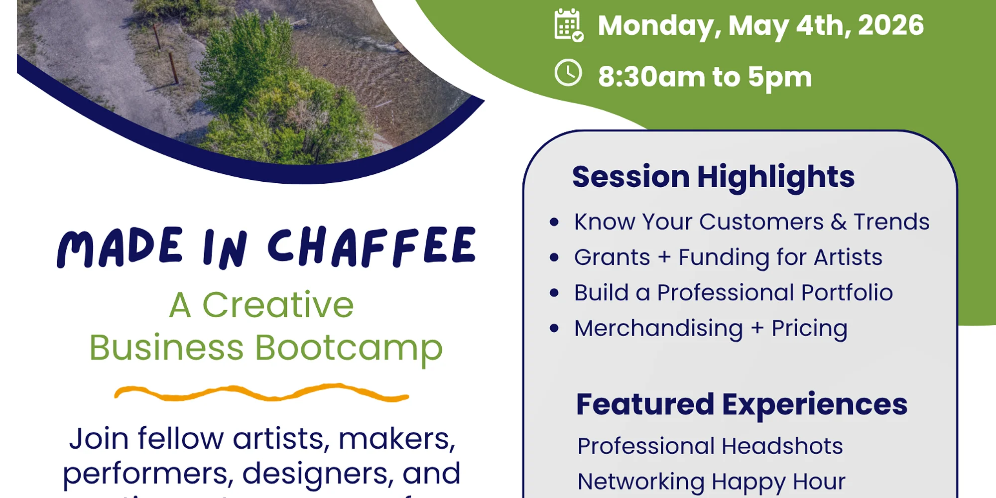 Join us on May 4th from 8:30 AM – 5 PM at the Salida SteamPlant Event Center for a full-day summit designed to support and strengthen Chaffee County’s creative economy. This hands-on bootcamp brings together artists, makers, and creative entrepreneurs for practical sessions, local insights, and meaningful connections. Whether you're just getting started or ready to grow, you can tailor the day to focus on what matters most to your work. ✨ Learn new skills ✨ Connect with fellow creatives ✨ Build your business Come ready to be inspired, collaborate, and invest in your creative future. 📌 Registration Note: To sign up, you’ll need to create a login with the Central Colorado Small Business Development Center if you’re not already a member-- Click HERE Presented by the City of Salida, Colorado, the Salida Creative District Program, and the Colorado Small Business Development Center.