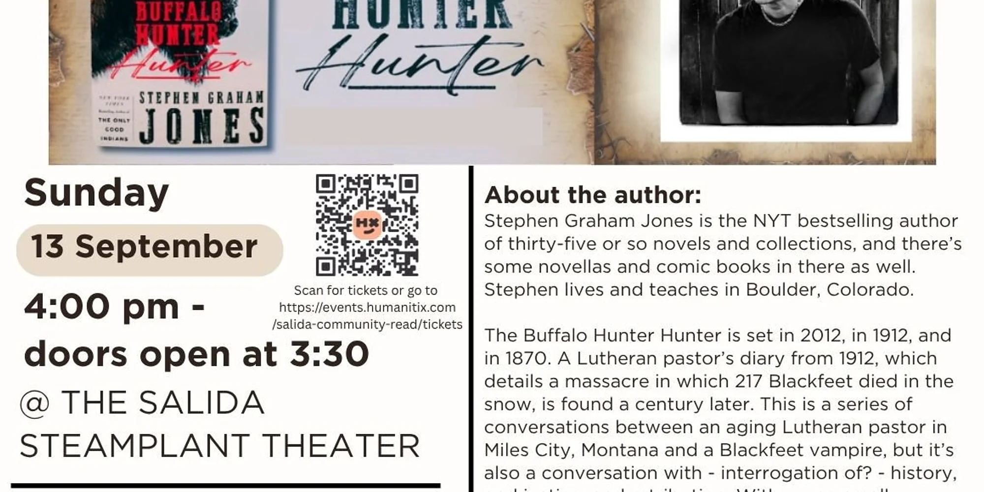 Salida's Community Read Author Talk and book signing with Stephen Graham Jones Book: The Buffalo Hunter Hunter Author Bio: Stephen Graham Jones is the NYT bestselling author of thirty-five or so novels and collections, and there’s some novellas and comic books in there as well. Stephen’s been an NEA recipient, has won the Texas Institute of Letters Award for Fiction, the Los Angeles Times Ray Bradbury Prize, the Mark Twain American Voice in Literature Award, the August Derleth British Fantasy Award for Best Horror Novel, the Independent Publishers Award for Multicultural Fiction, the Western Literature Association’s Distinguished Achievement Award, the American Library Association’s RUSA Award and Alex Award, the 2023 American Indian Festival of Words Writers Award, the Locus Award, four Bram Stoker Awards, three Shirley Jackson Awards, and six This is Horror Awards. Stephen’s also been inducted into the Texas Literary Hall of Fame, he’s been a finalist for the World Fantasy Award, and the Eisner Award, and he’s made Bloody Disgusting’s Top Ten Horror Novels, been a New York Times Book Club selection, and been on Barack Obama’s Summer Reading List. He’s the guy who wrote Mongrels, The Only Good Indians, My Heart is a Chainsaw,Earthdivers, I Was a Teenage Slasher, The Buffalo Hunter Hunter, and Killer on the Road. Stephen lives in Boulder, Colorado. Event Date: September 13, 2026 Doors open at 3:30, event begins at 4pm Free to register -- HERE Sponsored by Salida Regional Library and City of Salida Arts & Culture