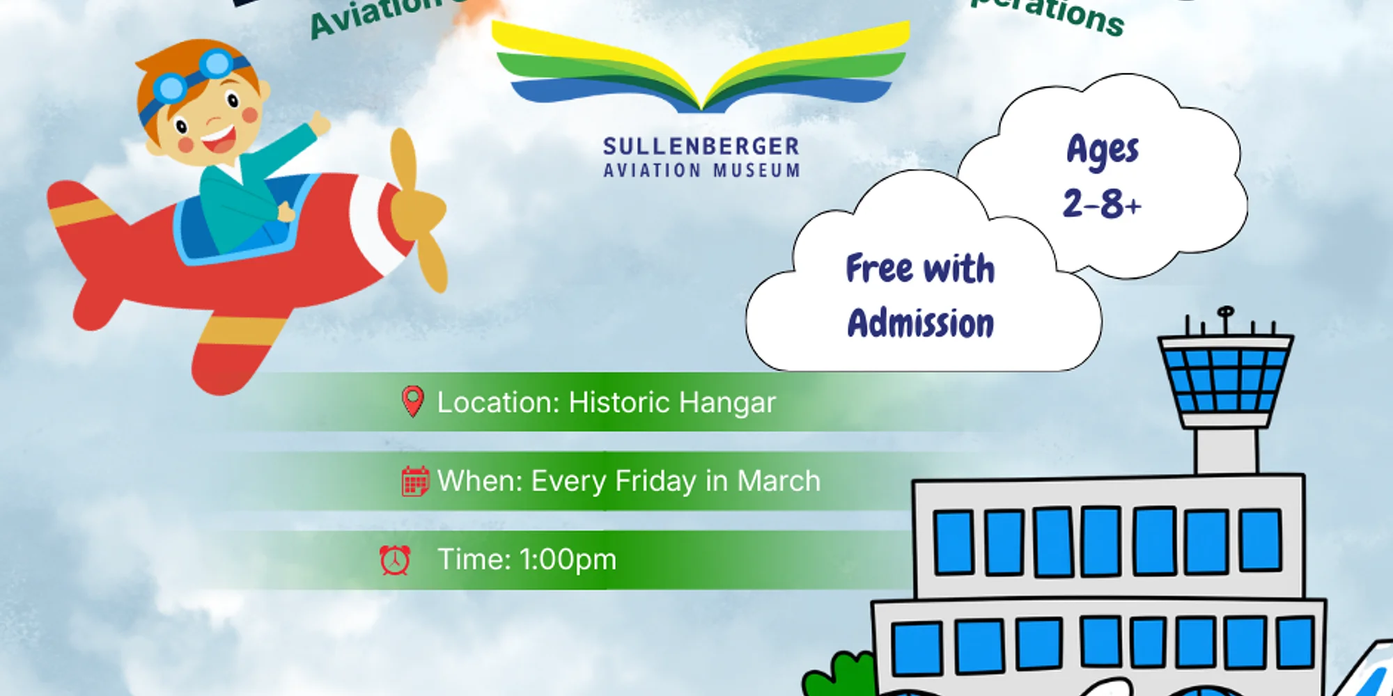 Join the Sullenberger Aviation Museum Education team every Friday in March at 11:00 am in our Historic Hanagar to hear aviation stories about airports and their operations. A new book will be featured each week. This activity is FREE with paid museum admission.