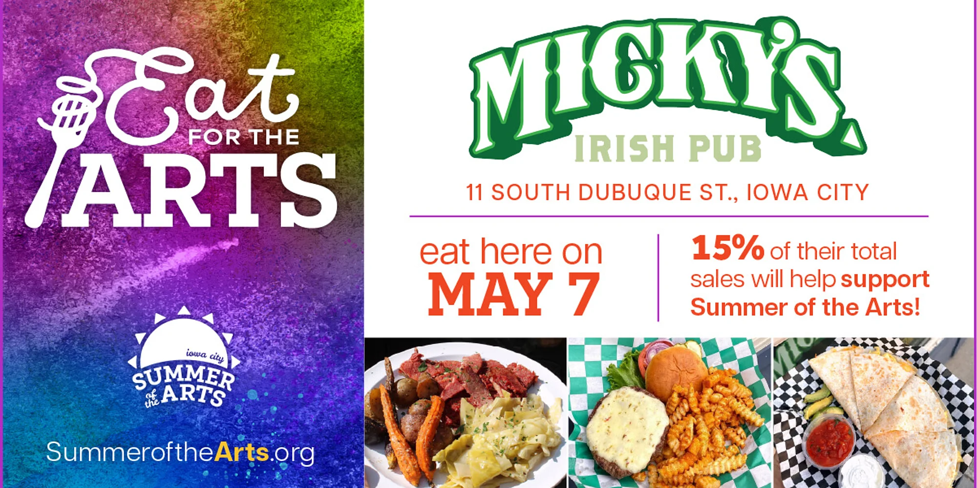 Join us on May 7 for Eat for the Arts at Micky’s Irish Pub! Whether you’re stopping in for lunch, dinner, or drinks, 15% of all sales will be donated to Summer of the Arts — supporting free, family-friendly arts programming across our community. Micky’s Irish Pub is a longtime favorite for craft brews, cocktails, and whiskey, featuring a vintage bar, patio seating, and a lively, welcoming atmosphere. It’s a perfect spot to enjoy great food and drinks while giving back to the arts. Eat well. Give back. Keep the arts thriving in our community!