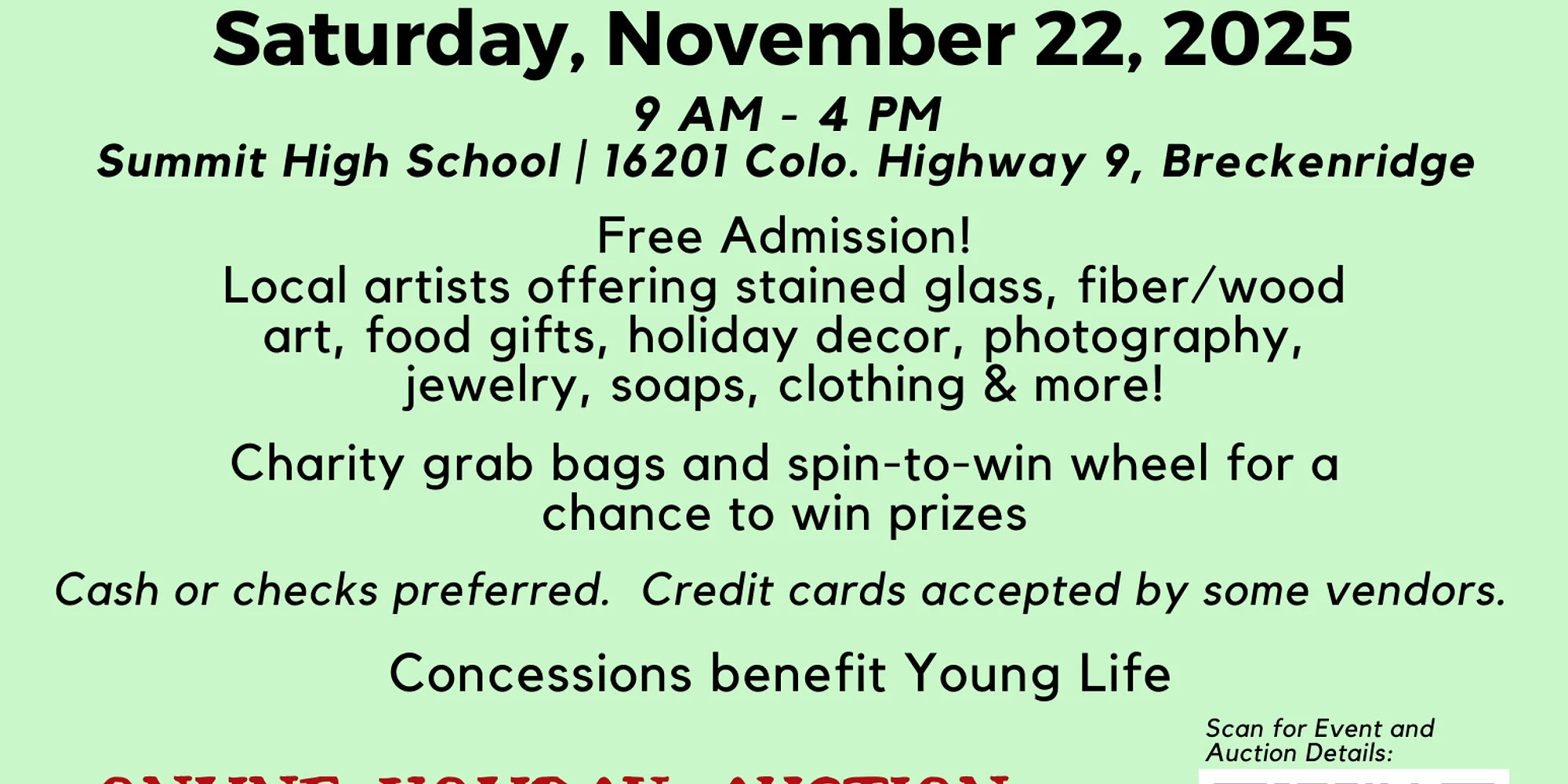 12th Annual Holiday Bazaar Local artists offering stained glass, fiber/wood art, food gifts, holiday decor, photography, jewelry, soaps, clothing & more! The Historical Society will also highlight its collection of published books. Guests can take part in Charity Grab Bags and spin the Spin-to-Win Wheel for a chance to win exciting prizes, including a special grand prize! Concessions provided by Young Life Date: Saturday, November 22 Time: 9:00 AM – 4:00 PM Cost: Free Location: Summit High School, 16201 Co Hwy 9, Breckenridge, CO NOTE: Cash or checks preferred. Credit cards accepted by some vendors. Thanks to our sponsors: Alpine Bank, Mike Bohlender – Liv|Sotheby’s, Summit Daily News Online Holiday Auction – Auction Link Celebrate the season by bidding, giving, and preserving Summit County’s rich history! Our Online Holiday Auction is Coming! Kick off the holiday season early with our Holiday Auction, opening one week before the Bazaar! From November 14 – 21,This year’s auction features an exciting collection of exclusive experiences and vintage treasures — each with its own story and a special connection to our mountain heritage. Bidding Opens: November 14 at 12:00 AM Bidding Closes: November 21 at 5:00 PM Every bid directly supports the Summit Historical Society’s preservation and education programs. Shop local. Support history. Celebrate the season.