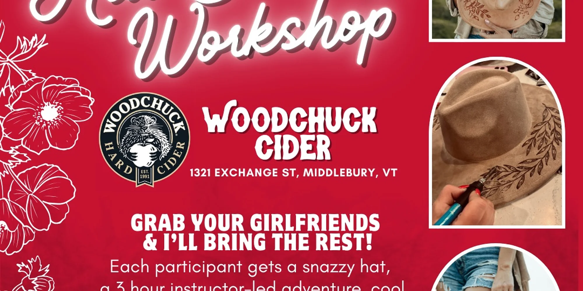 Grab your girls and get ready for a creative night out! We’re talking hats, drinks, and all the DIY fun you can handle. No art skills? No problem! You’ll pick out your own hat (or tote!), then burn in your unique design using stencils and tools (don’t worry, we’ll show you how!). Plus, there’s a hat bar loaded with cute accessories so you can totally customize your look. Sip, style, and burn—it’s the ultimate girls’ night!