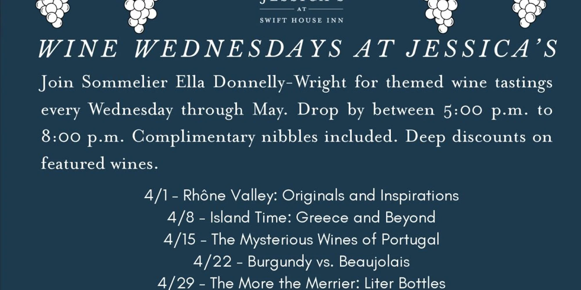 Escape the cold weather with Wine Wednesdays! Join sommelier Ella Donnelly-Wright on a journey through the riveting history of wine. 4/1 – Rhône Valley: Originals and Inspirations 4/8 – Island Time: Greece and Beyond 4/15 – The Mysterious Wines of Portugal 4/22 – Burgundy vs. Beaujolais 4/29 – The More the Merrier: Liter Bottles