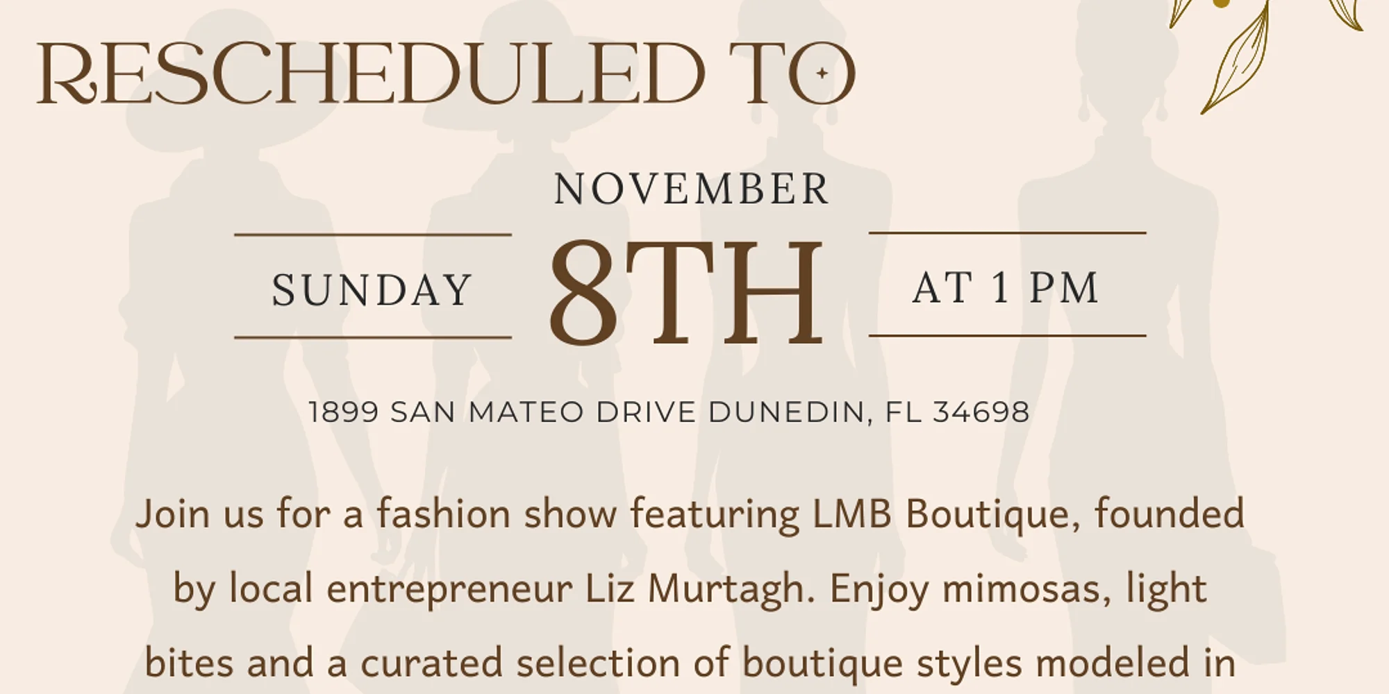 November 8 | 1–3 PM Due to museum scheduling adjustments, Fashion & Mimosas has been rescheduled to November 8 from 1–3 PM at Andrews Memorial Chapel. We look forward to gathering for this special afternoon and appreciate your continued support. Fashion & Mimosas will feature a runway-style presentation showcasing selections from LMB Boutique, founded by local entrepreneur Liz Murtagh. Inspired by her travels and passion for thoughtfully curated style, Liz’s boutique reflects a distinctive blend of fashion thoughtfully brought back home to Dunedin. Guests will enjoy mimosas while viewing a curated selection of clothing and accessories modeled from the boutique, including dresses, blazers, tops, footwear, jewelry, and more. The event will take place within the historic setting of Andrews Memorial Chapel. Ticket Pricing: $45 per member | $55 per non-member Sponsorship Opportunity — $250 Includes two event tickets along with recognition during the event, on event flyers, and in printed event programs. Sponsorships provide a meaningful way to support the museum’s mission and vision while gaining visibility at this special event. In the meantime, we encourage you to visit LMB Boutique and explore Liz’s beautiful collection in person. LMB Boutique 764 Main St, Dunedin, FL 34698 (727) 314-4313 For More Information call (727) 736-1176 or email us at admin@dunedinmuseum.org Get Tickets