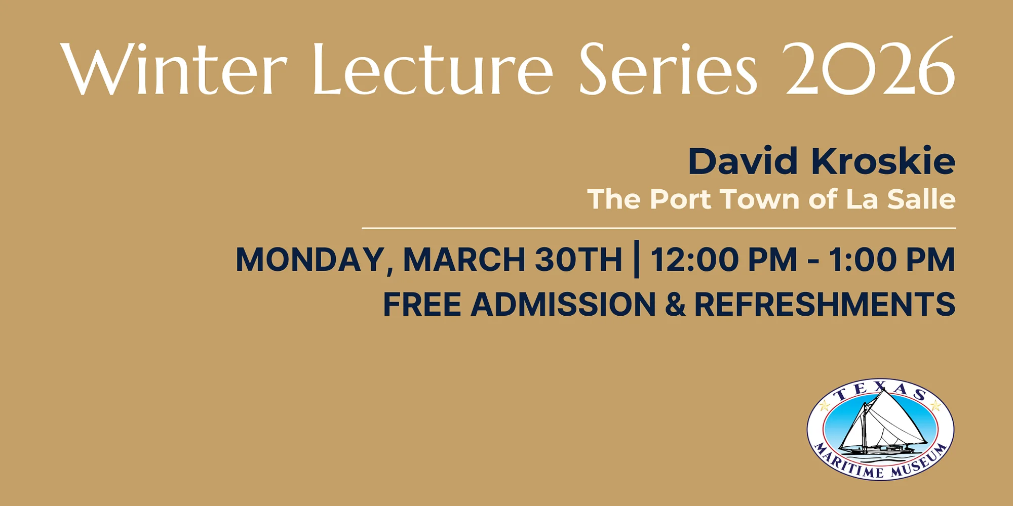 Join us for the conclusion of our Winter Lecture Series with a fascinating look at early Texas maritime history in “The Port Town of La Salle,” presented by David Kroskie, on Monday, March 30th, from 12:00 PM to 1:00 PM, the final lecture in our 2026 series. This engaging presentation explores the story of the Port Town of La Salle and its role in the early development of the Texas coast. David Kroskie will examine the historical significance of this short-lived but influential settlement, shedding light on how ports, trade, and ambition shaped Texas’s maritime beginnings. The lecture offers insight into the people, geography, and circumstances that made La Salle an important chapter in the state’s coastal history. As the concluding program of the season, this lecture provides a fitting close to a series dedicated to Texas and maritime history. A Q&A session will follow, giving attendees the opportunity to reflect on the topic and engage directly with the speaker. Admission is free, with donations gratefully accepted. Enjoy coffee and light refreshments, generously provided by H-E-B and Duck Blind Coffee, whose continued support helps make this Winter Lecture Series possible. View all upcoming museum events to see what else is happening at the Texas Maritime Museum. Stay Connected Don’t miss this, or any of our other exciting lectures, educational workshops, or special events. Follow the Texas Maritime Museum on social media for updates and inspiration: Facebook | Instagram | Subscribe to Our Emails Join us for this special final lecture and help us wrap up a memorable season of learning, history, and community.
