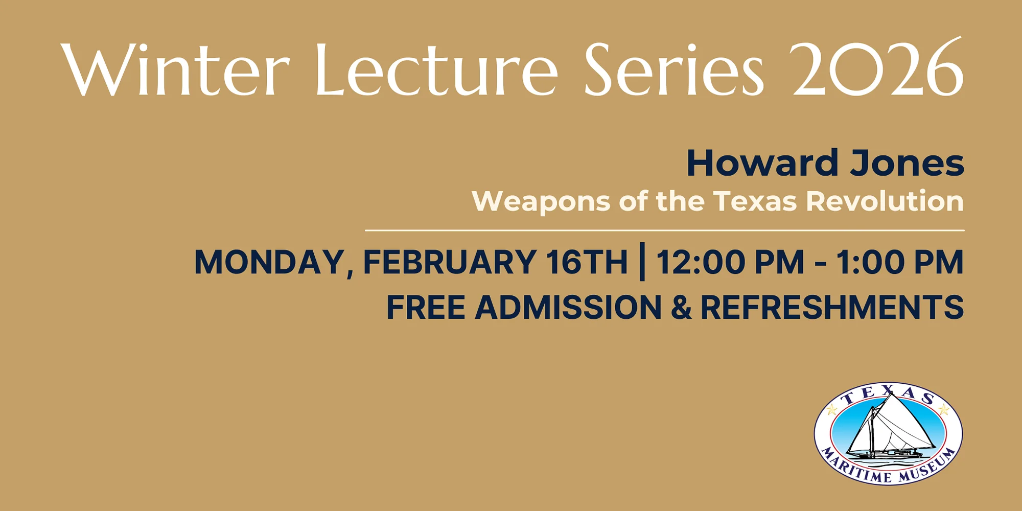 Join us for an in-depth and engaging installment of our Winter Lecture Series with “Weapons of the Texas Revolution,” presented by Howard Jones, on Monday, February 16th, from 12:00 PM to 1:00 PM. This fascinating lecture offers an exploration of the weapons and military equipment used during the Texas Revolution and the role they played in shaping one of the most defining periods in Texas history. From firearms and artillery to everyday tools adapted for battle, the discussion will consider how access to weaponry, innovation, and practicality influenced strategy, survival, and outcomes on the battlefield. Designed for history enthusiasts of all levels, this presentation balances historical insight with engaging storytelling and thoughtful analysis. The lecture will conclude with a Q&A session, giving attendees the opportunity to ask questions and further explore the topic with the speaker. Admission is free, with donations gratefully accepted. Attendees are invited to enjoy coffee and light refreshments, generously provided by H-E-B and Duck Blind Coffee, whose support makes this popular lecture series possible. View all upcoming museum events to see what else is happening at the Texas Maritime Museum. Stay Connected Don’t miss this or any of our other exciting lectures, educational workshops, or special events. Follow the Texas Maritime Museum on social media for updates and inspiration: Facebook | Instagram | Subscribe to Our Emails Join us for an informative and memorable lunchtime program that brings the Texas Revolution into sharper focus through the tools that helped shape it.