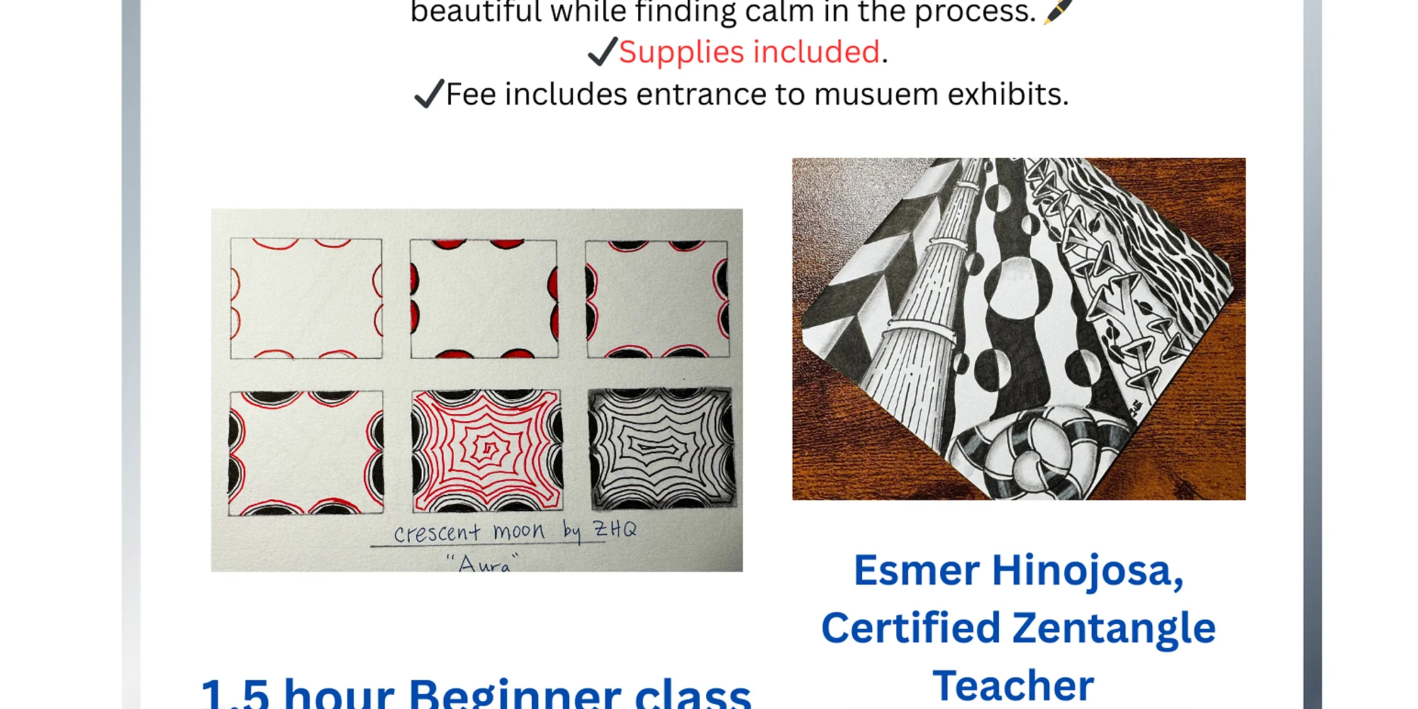 In this class you will learn how you make a Zentangle and artistic and mindfulness practices that come with it. Come learn a practice that you can take anywhere with you! Supplies included for the class. Take home supply kits available for purchase.