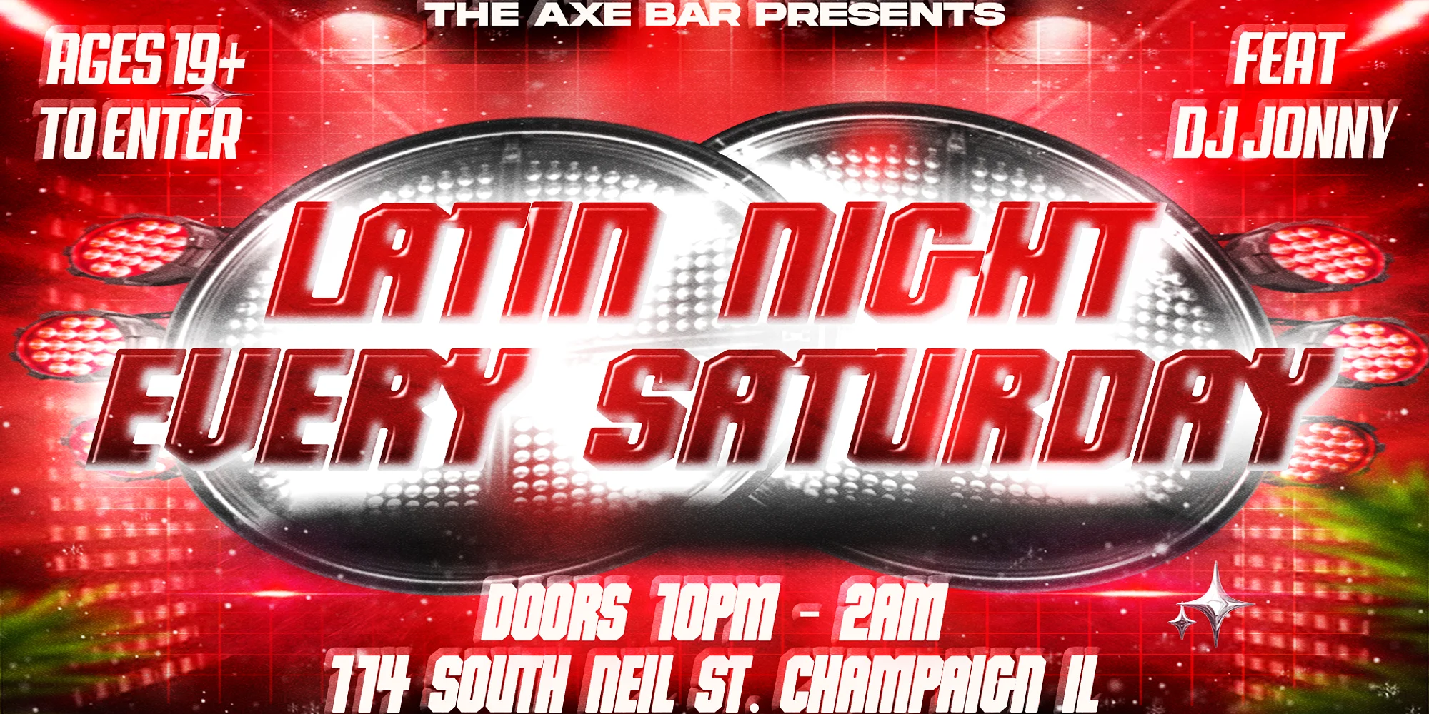 💃🔥 LATIN NIGHT EVERY SATURDAY at The Axe Bar 🔥💃 Central Illinois’ BIGGEST and BEST Latin Night happens every Saturday only at The Axe Bar! Get ready to dance the night away to the hottest mix of Reggaeton, Cumbia, Bachata, Merengue, Dembow, Bandas y más! 🎶 We will fill up—EARLY ARRIVAL IS HIGHLY SUGGESTED. 👀 🕘 Every Saturday | 9PM–2AM 🎧 Music by DJ Jonny 💸 $20 Cover 🍸 Full Bar | 🍔 Kitchen Open Late 📍 114 S. Neil St, Champaign IL