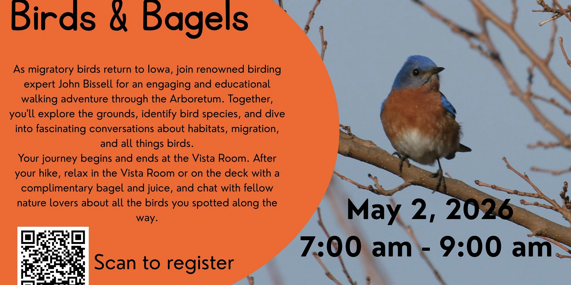 @ Welcome Back, Feathered Friends! Spring Bird Walk with local bird enthusiast John Bissell As migratory birds return to Iowa, join local bird enthusiast John Bissell for an engaging and educational walking adventure through the Arboretum. Together, you’ll explore the grounds, identify bird species, and dive into fascinating conversations about habitats, migration, and all things birds. Your journey begins and ends at the Vista Room. . After your hike, relax in the Vista Room or the deck with a complimentary bagel and juice, and chat with fellow nature lovers about all the birds you spotted along the way. Event Details: 🌿 All ages welcome (children under 14 must be accompanied by an adult) 🐶 No dogs, please 🧥 Dress for outdoor exploration—this program takes place entirely outside 🔭 Don’t forget your binoculars! Come celebrate the beauty of spring migration and immerse yourself in the world of birds. We can’t wait to explore with you! Cost is $5.00 for members and $10.00 for non-members Add to calendar Google Calendar iCalendar Outlook 365 Outlook Live